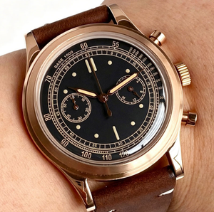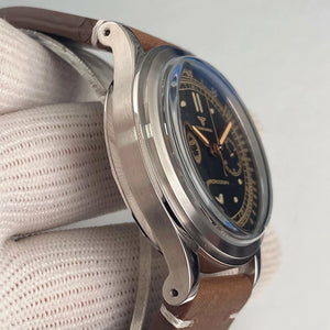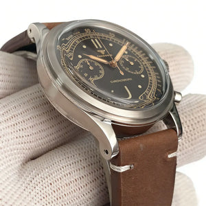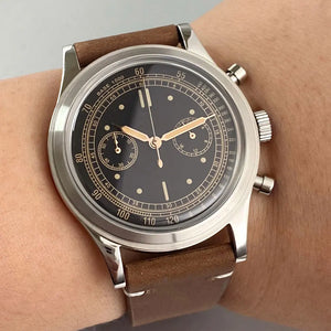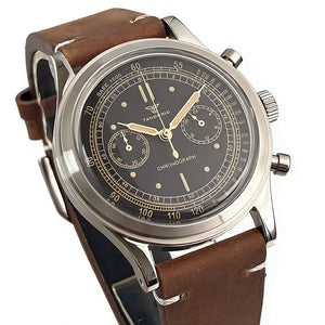 Capture vintage chronograph style with the Tandorio TD911 Pilot Watch, powered by a reliable Miyota OS20 quartz movement. The 38mm stainless steel case houses a classic black dial with no date, offering a clean, retro aesthetic. Finished with a domed sapphire glass and a comfortable leather strap, this timepiece delivers timeless elegance without the maintenance of automatic movements.