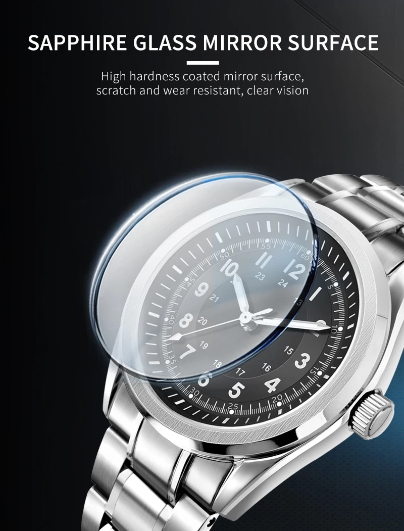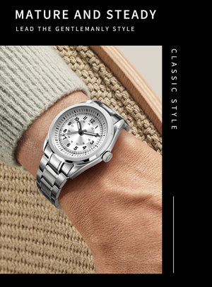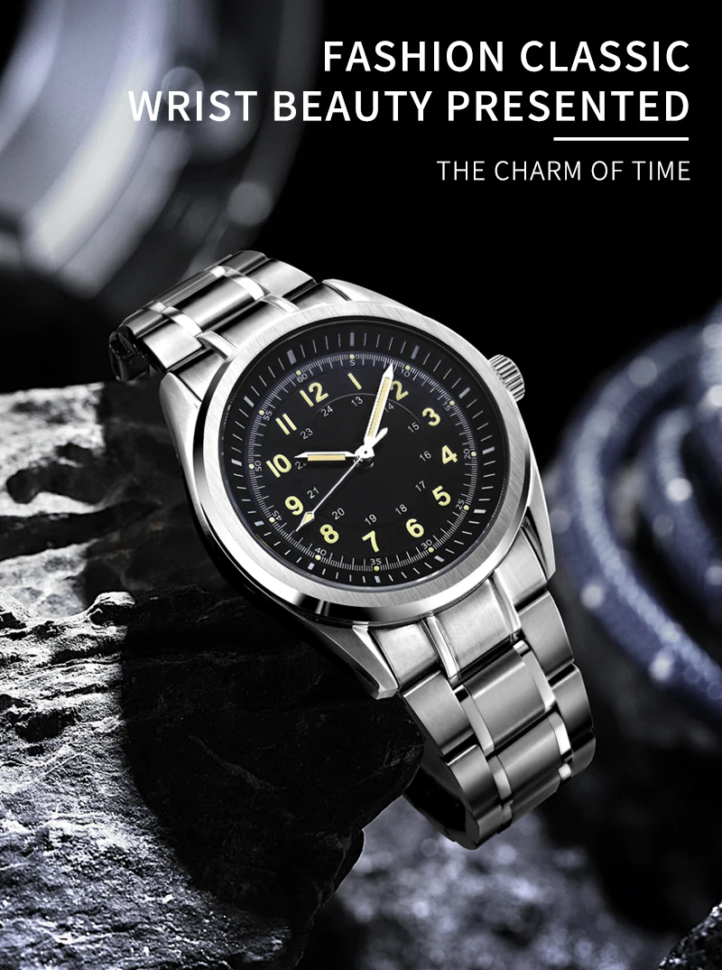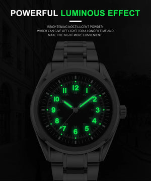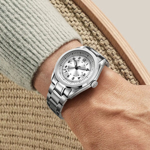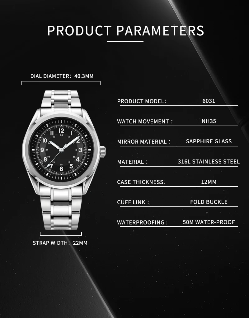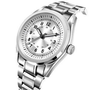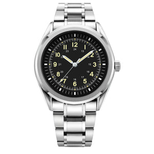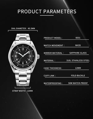 Experience reliable precision with the Corgeut 6031, a rugged 40mm field watch powered by a Japan NH35 automatic movement. The 316L stainless steel case houses a clean, legible dial protected by sapphire glass. With 50m water resistance and a comfortable 22mm strap, this 40mm field watch is ready for daily adventures both on and off the beaten path.