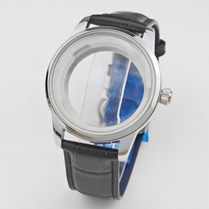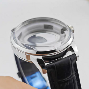 Exhibition Case Back: The transparent glass back allows a clear view of the automatic movement, showcasing the mechanical craftsmanship.