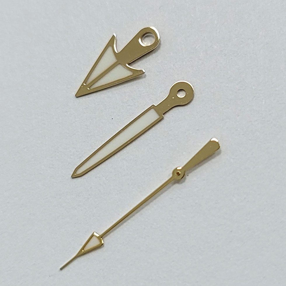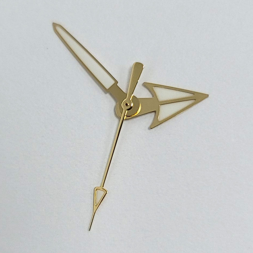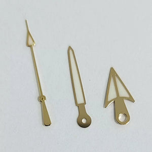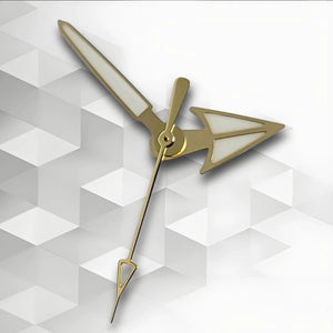 Elevate your custom build with these gold watch hands, featuring an elegant arrow and umbrella (Phnom Penh) design. Available in white or green luminous finishes, this hand set is specifically crafted for Japanese NH35, NH36, 4R, and 7S movements. The luxurious gold tone adds vintage sophistication to any pilot or dress watch project.
