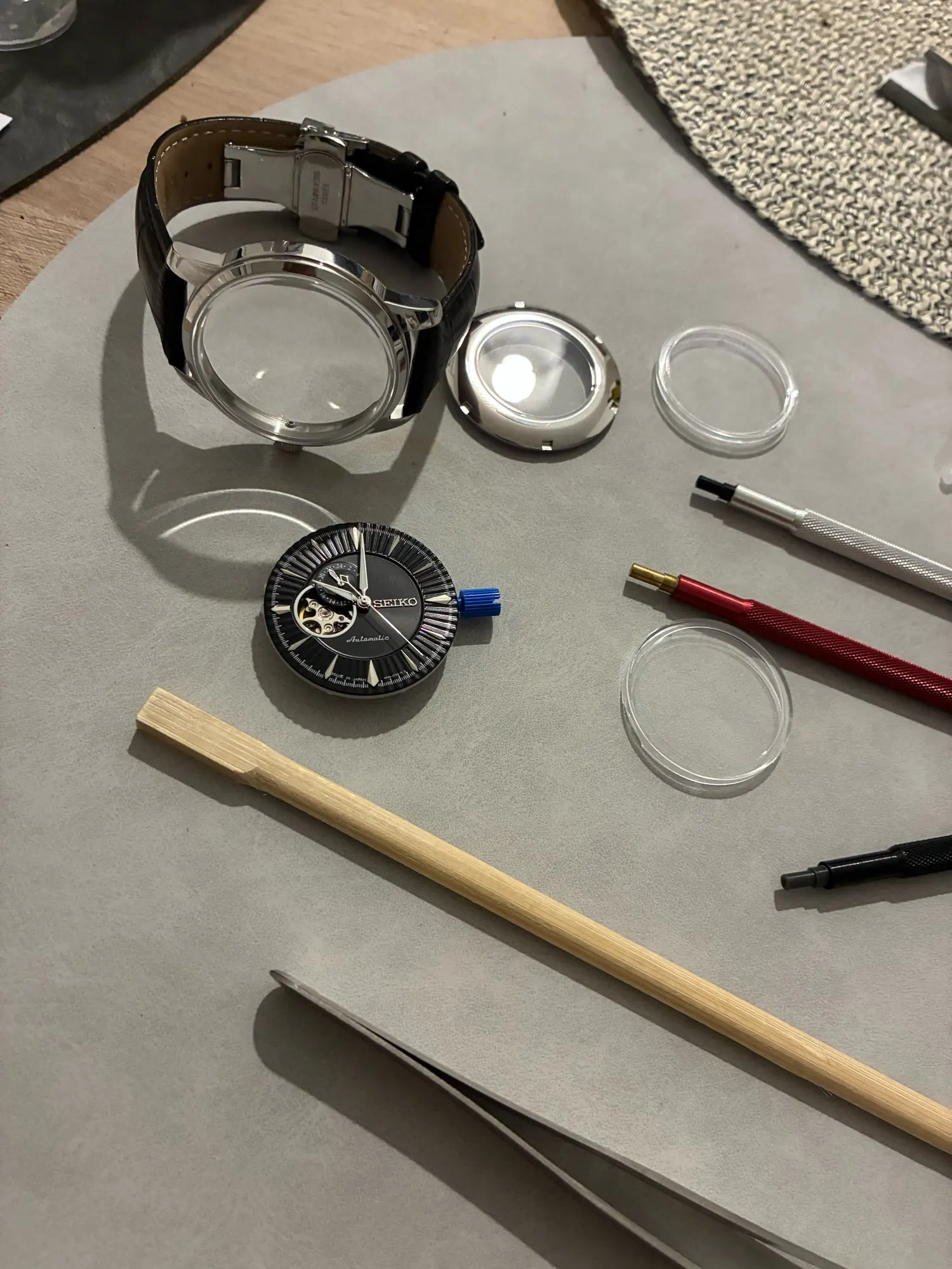 A dependable Japanese automatic movement featuring a no-date, open-heart design that highlights the balance wheel at 6 o’clock. Known for stability, smooth operation, and easy servicing, it’s a popular choice for mod and custom watches.