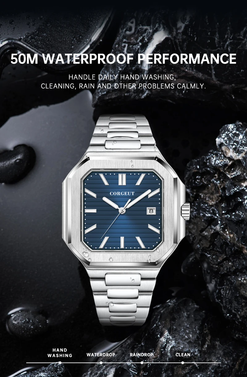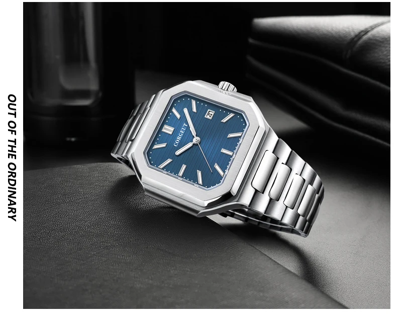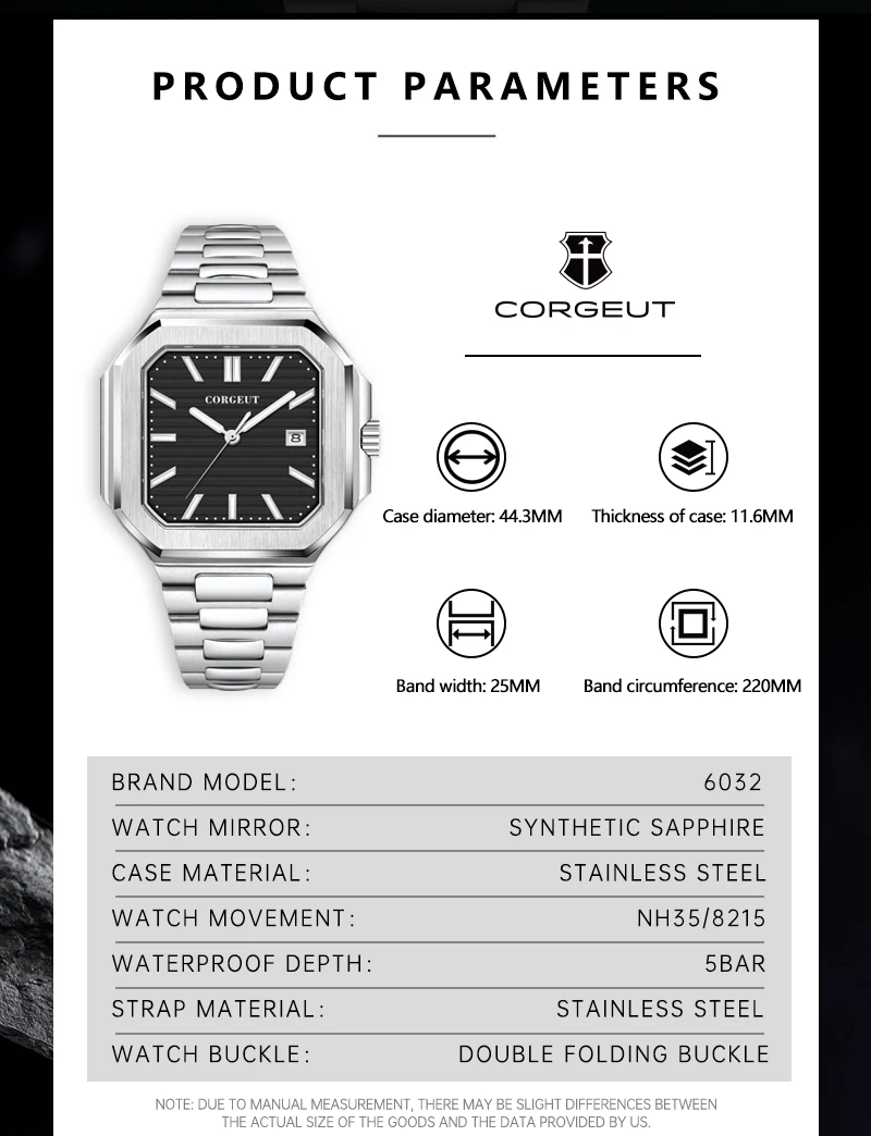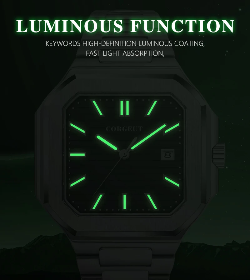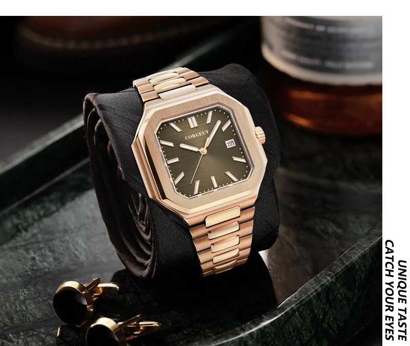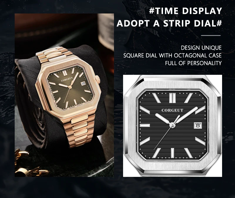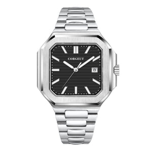 Presenting the Corgeut 6032 – a striking square automatic watch that blends vintage elegance with modern durability. Housed in a polished 44mm 316L stainless steel case and protected by a scratch-resistant sapphire crystal, it commands attention. Powered by a reliable Seiko NH35 or Miyota 8215 automatic movement, this timepiece offers precision engineering. Completed with a solid steel bracelet and 5ATM water resistance, it is a sophisticated daily companion.