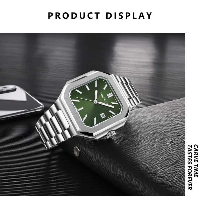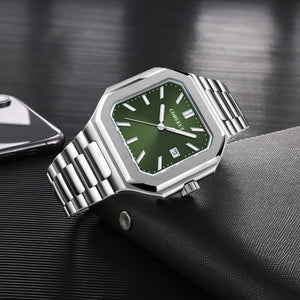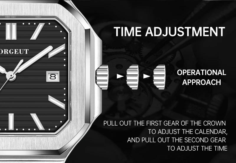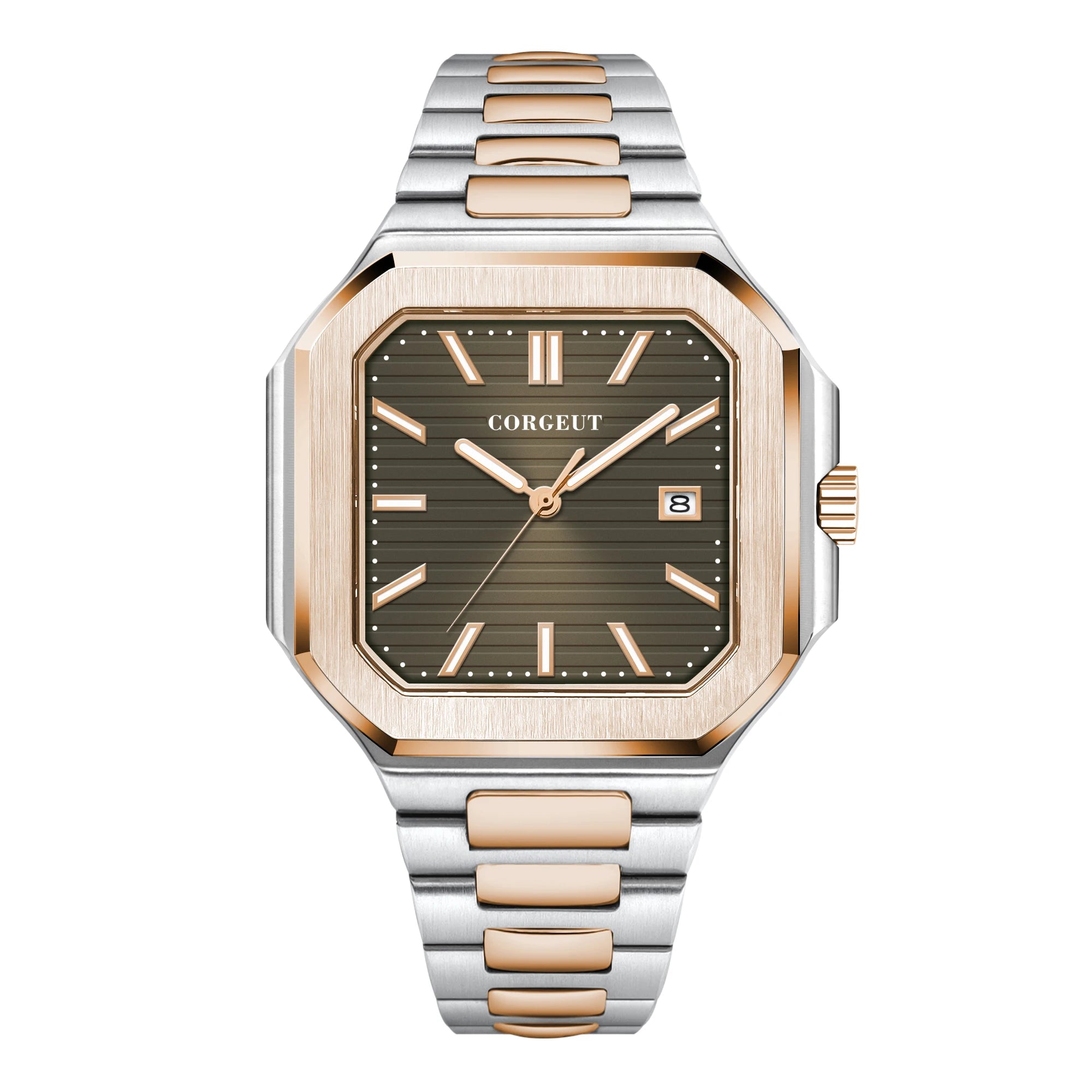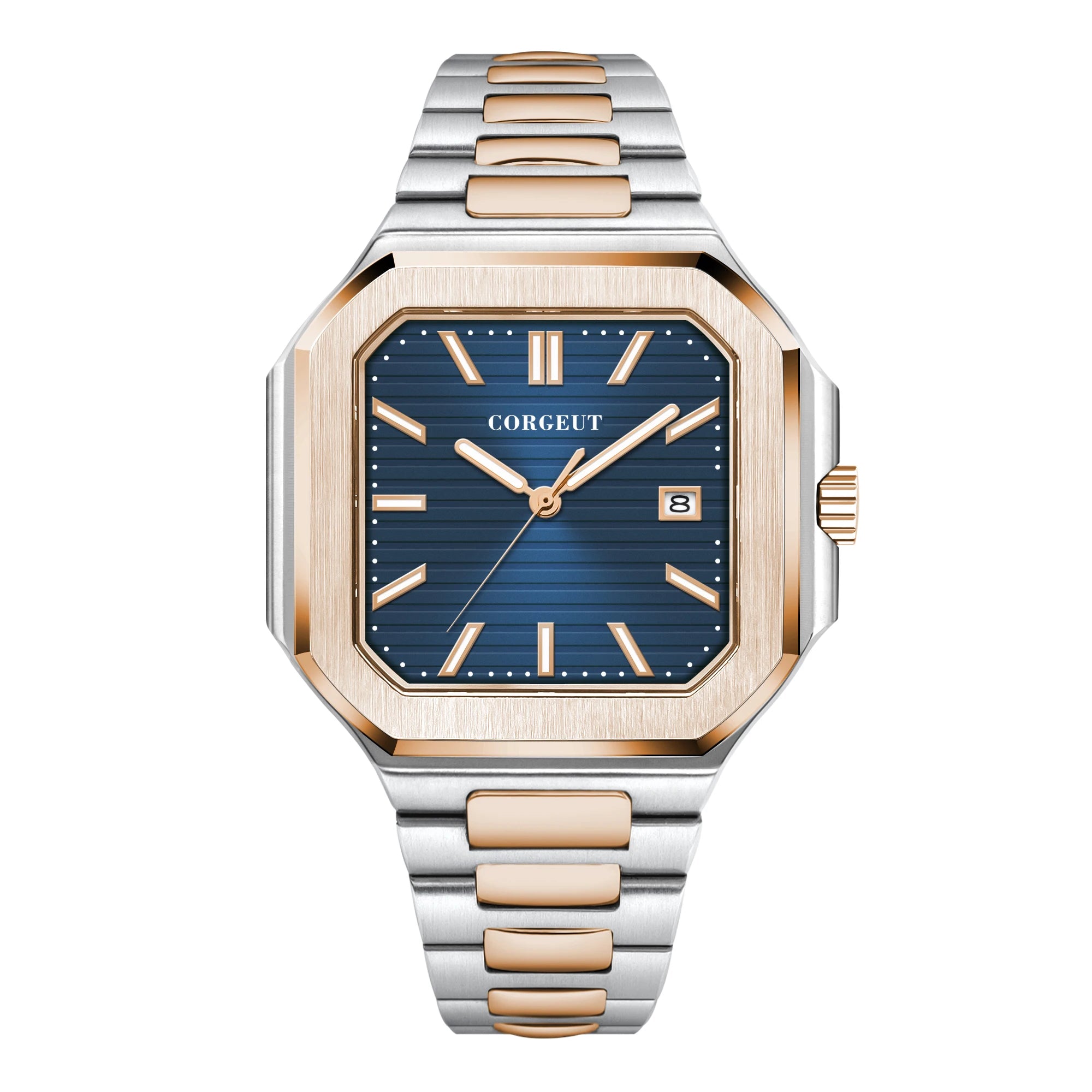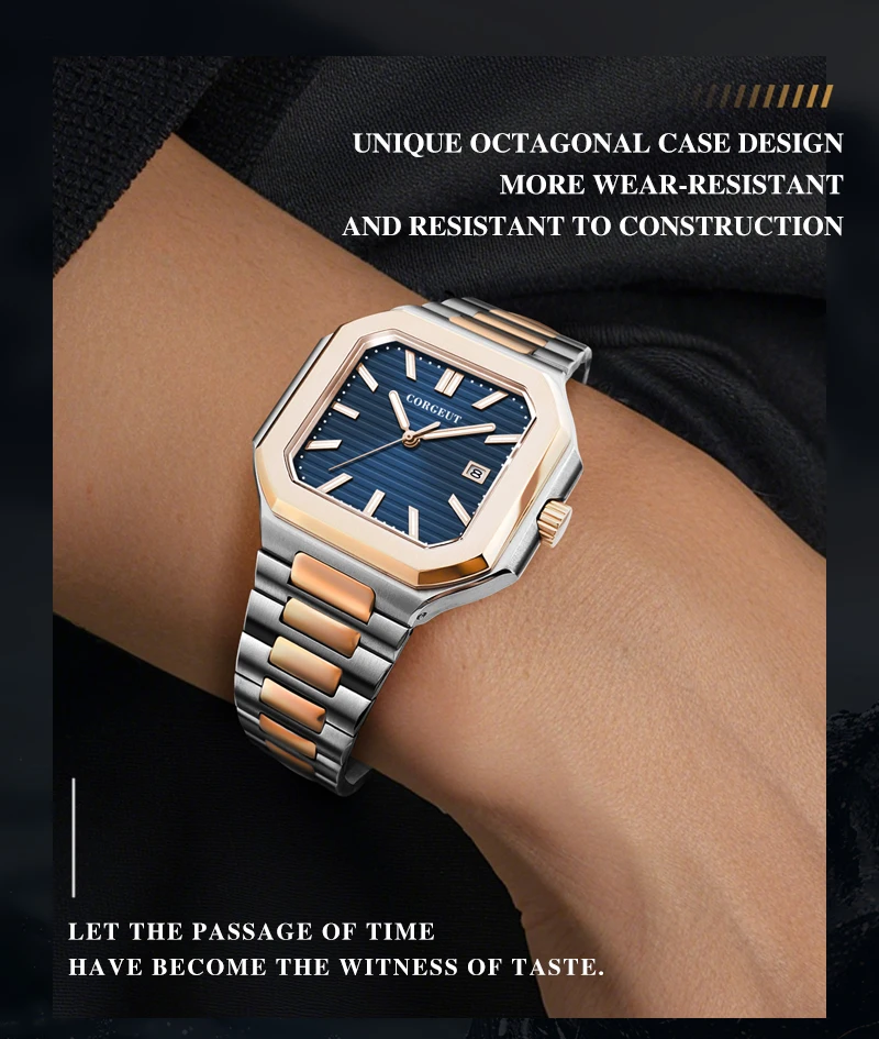 Presenting the Corgeut 6032 – a striking square automatic watch that blends vintage elegance with modern durability. Housed in a polished 44mm 316L stainless steel case and protected by a scratch-resistant sapphire crystal, it commands attention. Powered by a reliable Seiko NH35 or Miyota 8215 automatic movement, this timepiece offers precision engineering. Completed with a solid steel bracelet and 5ATM water resistance, it is a sophisticated daily companion.