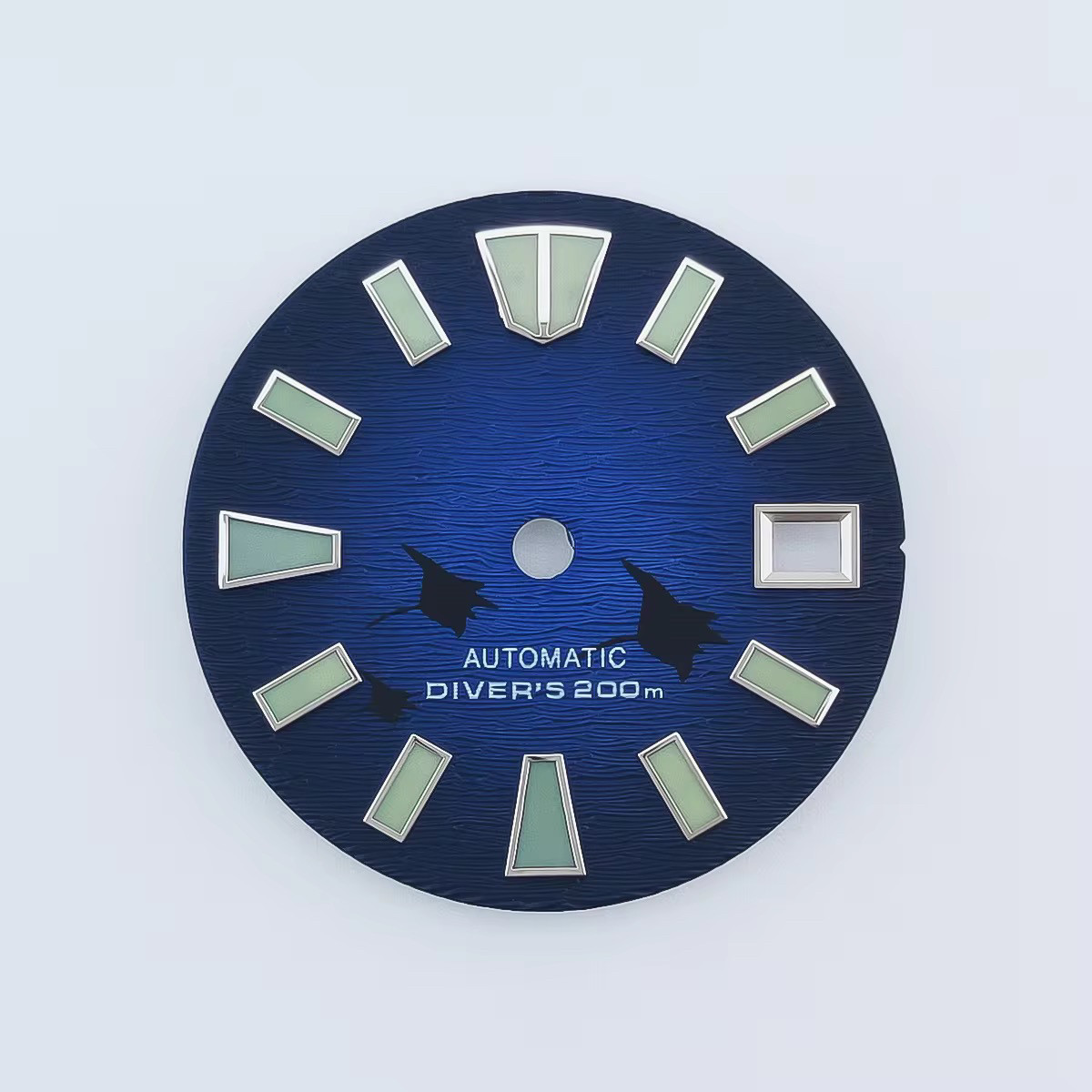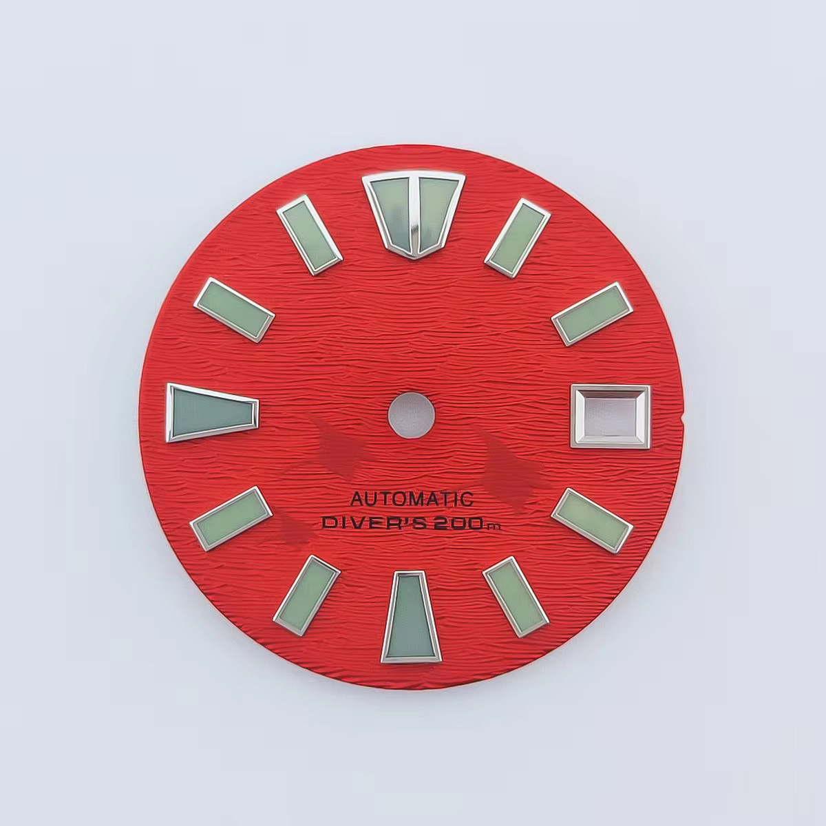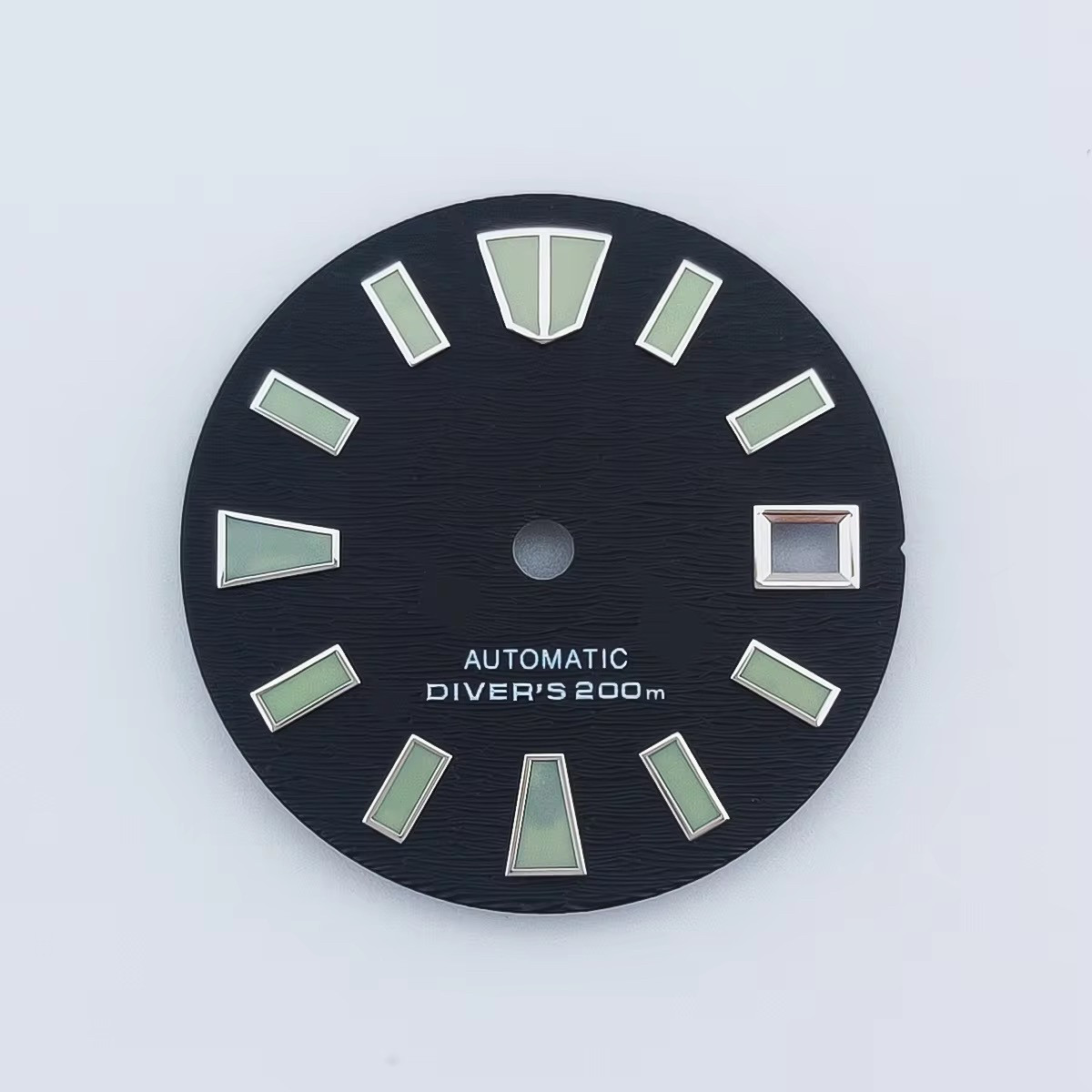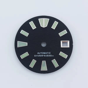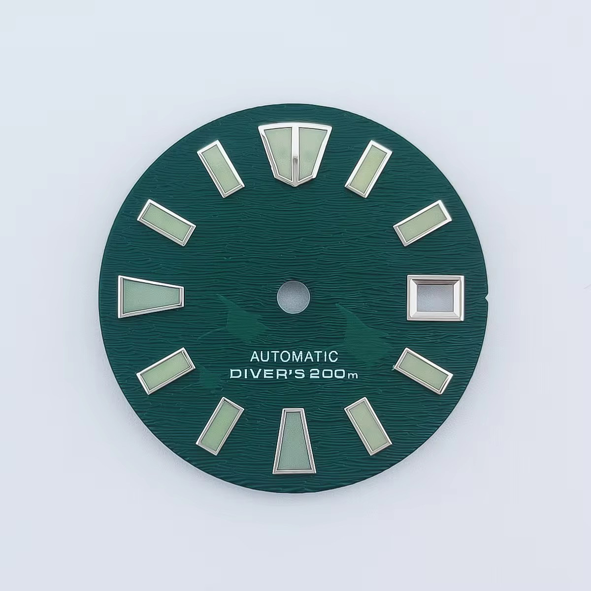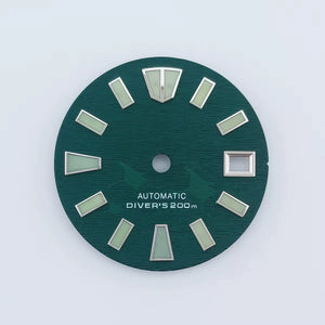 Elevate your custom build with this 29mm watch dial, crafted specifically for NH35 and NH36 movements. The striking green luminous light ensures exceptional visibility in any condition. Featuring a half-sterile layout with scripts above 6 o'clock and a bold shield bar at 12 o'clock, this dial delivers a clean yet distinctive aesthetic for any tool watch project.