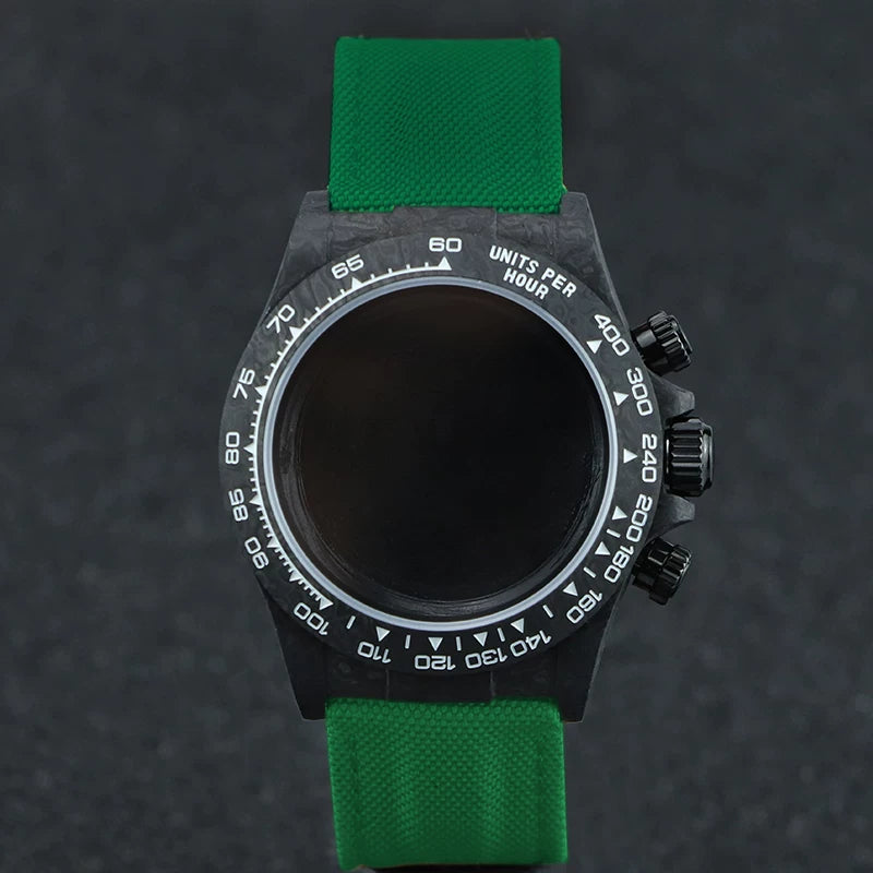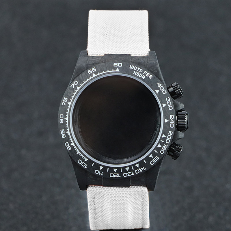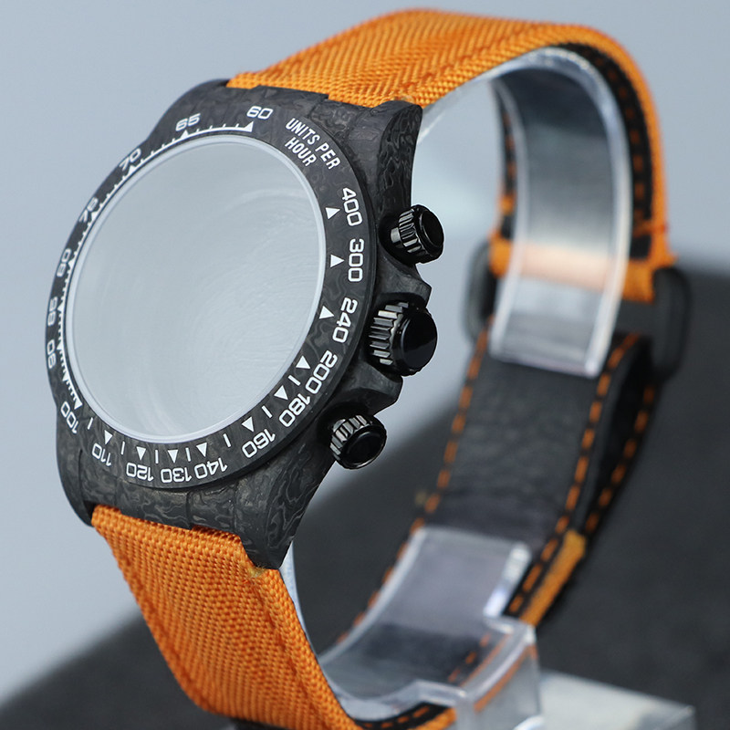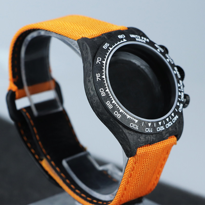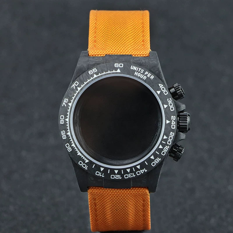 Presenting a lightweight 38mm Daytona-style watch case crafted from high-quality carbon fiber, offering exceptional durability and a distinctive textured finish. The case features full sapphire crystal glass for superior scratch resistance and accommodates both automatic (4130) and quartz (VK63) movements. Complete with both nylon and leather strap options, this versatile case is perfect for custom builders seeking a unique, modern take on a classic racing chronograph design.