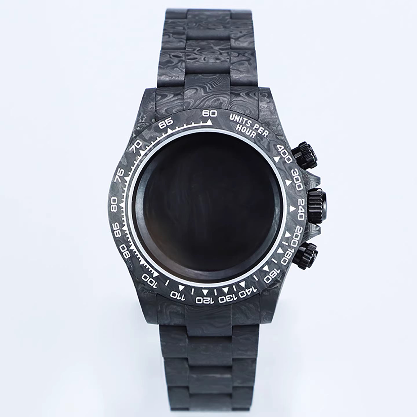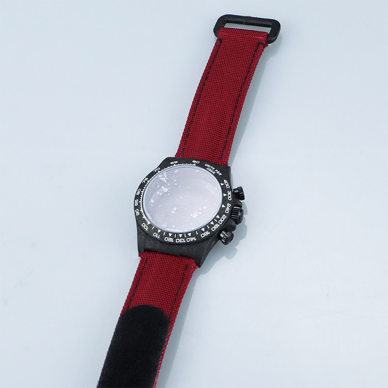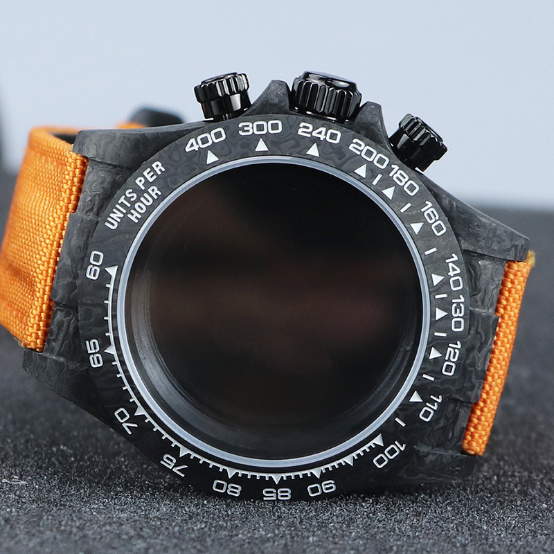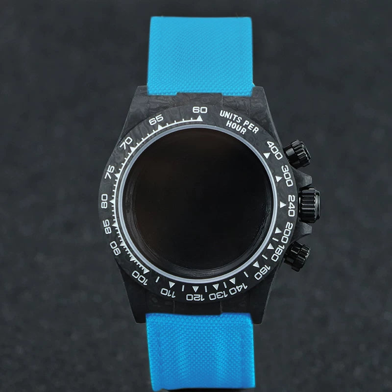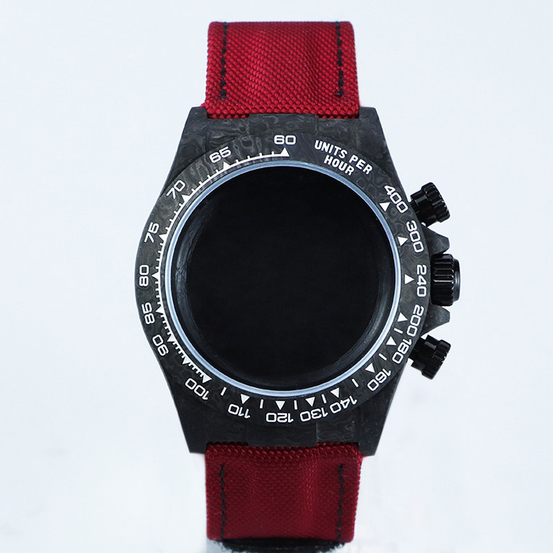Presenting a lightweight 38mm Daytona-style watch case crafted from high-quality carbon fiber, offering exceptional durability and a distinctive textured finish. The case features full sapphire crystal glass for superior scratch resistance and accommodates both automatic (4130) and quartz (VK63) movements. Complete with both nylon and leather strap options, this versatile case is perfect for custom builders seeking a unique, modern take on a classic racing chronograph design.