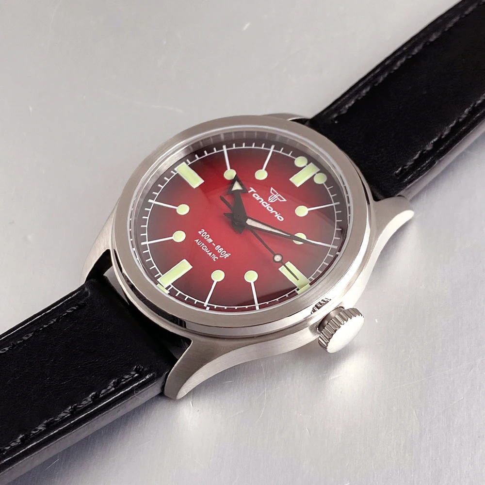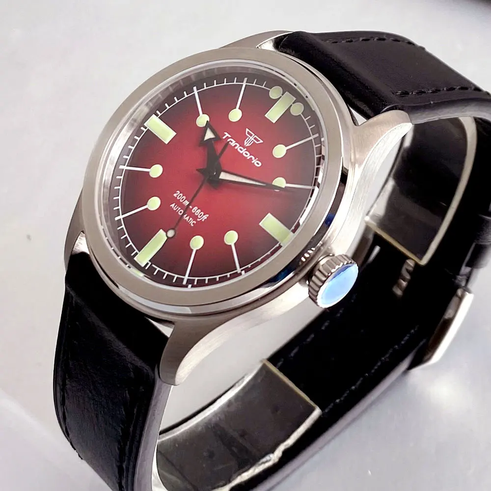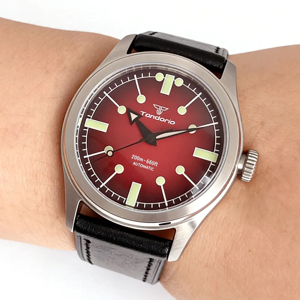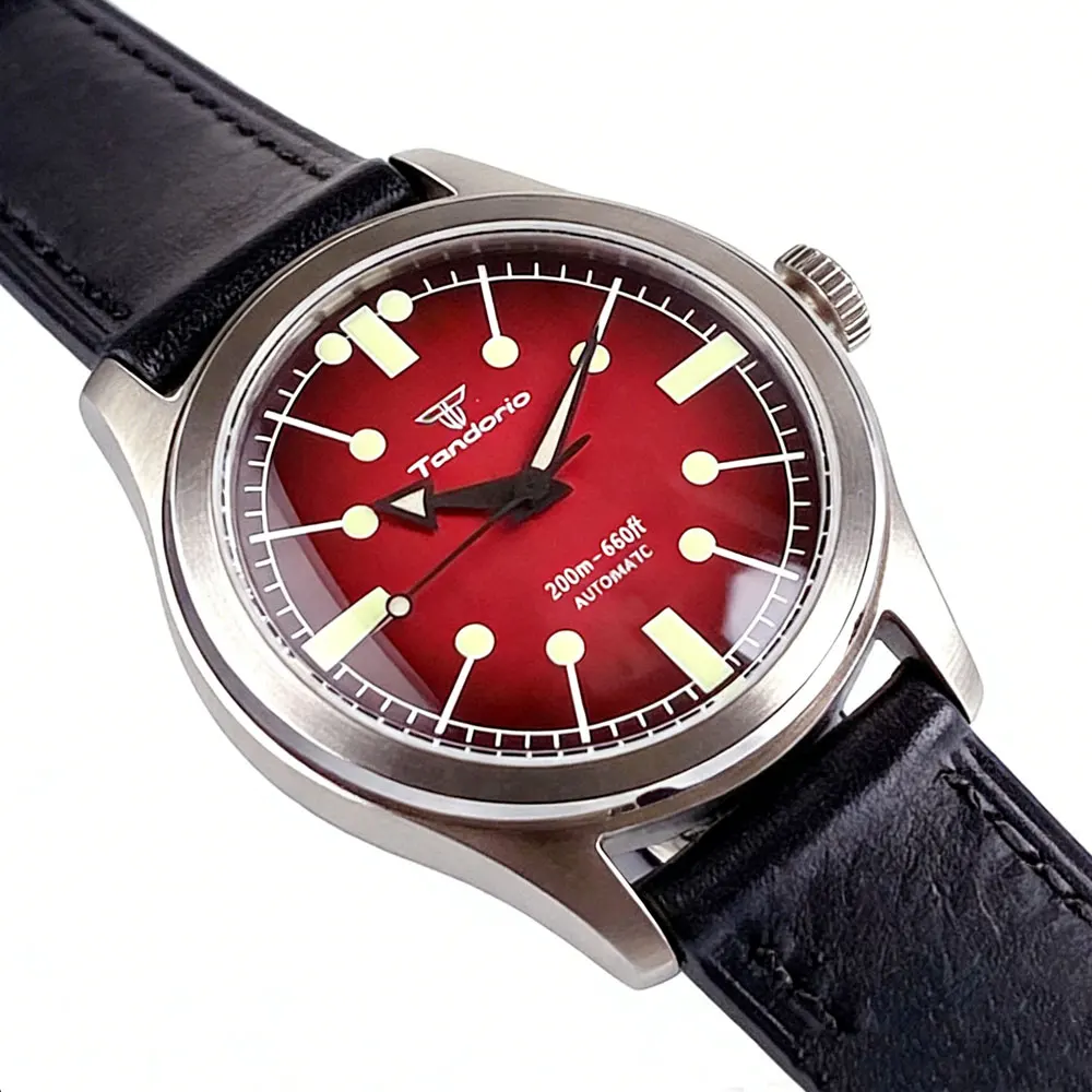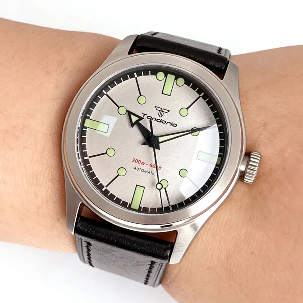 Embrace vintage aviation style with the Tandorio TD158A Pilot Watch, a 38mm field timepiece built for durability. Powered by your choice of NH35A or PT5000 automatic movements, it features a double-domed sapphire crystal and 20ATM water resistance. The bold dial with luminous markers ensures exceptional legibility, while the leather strap completes the classic pilot aesthetic.