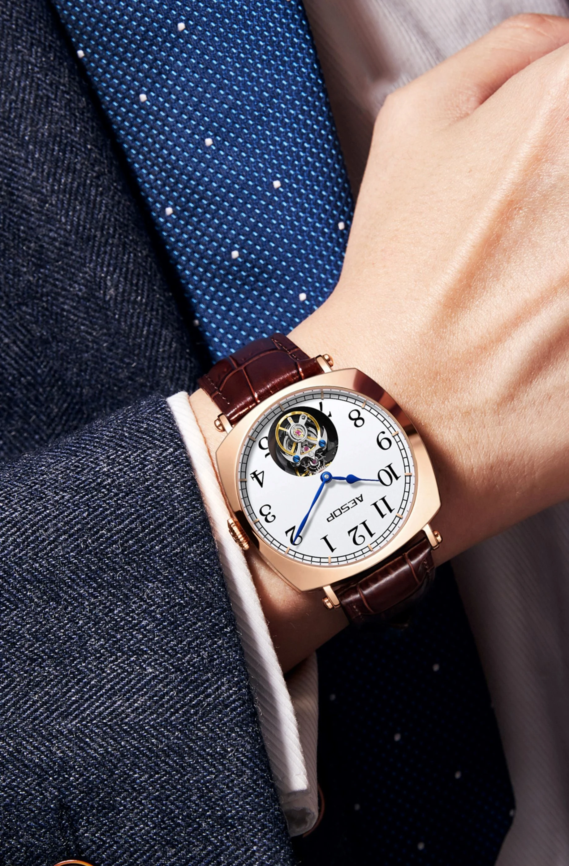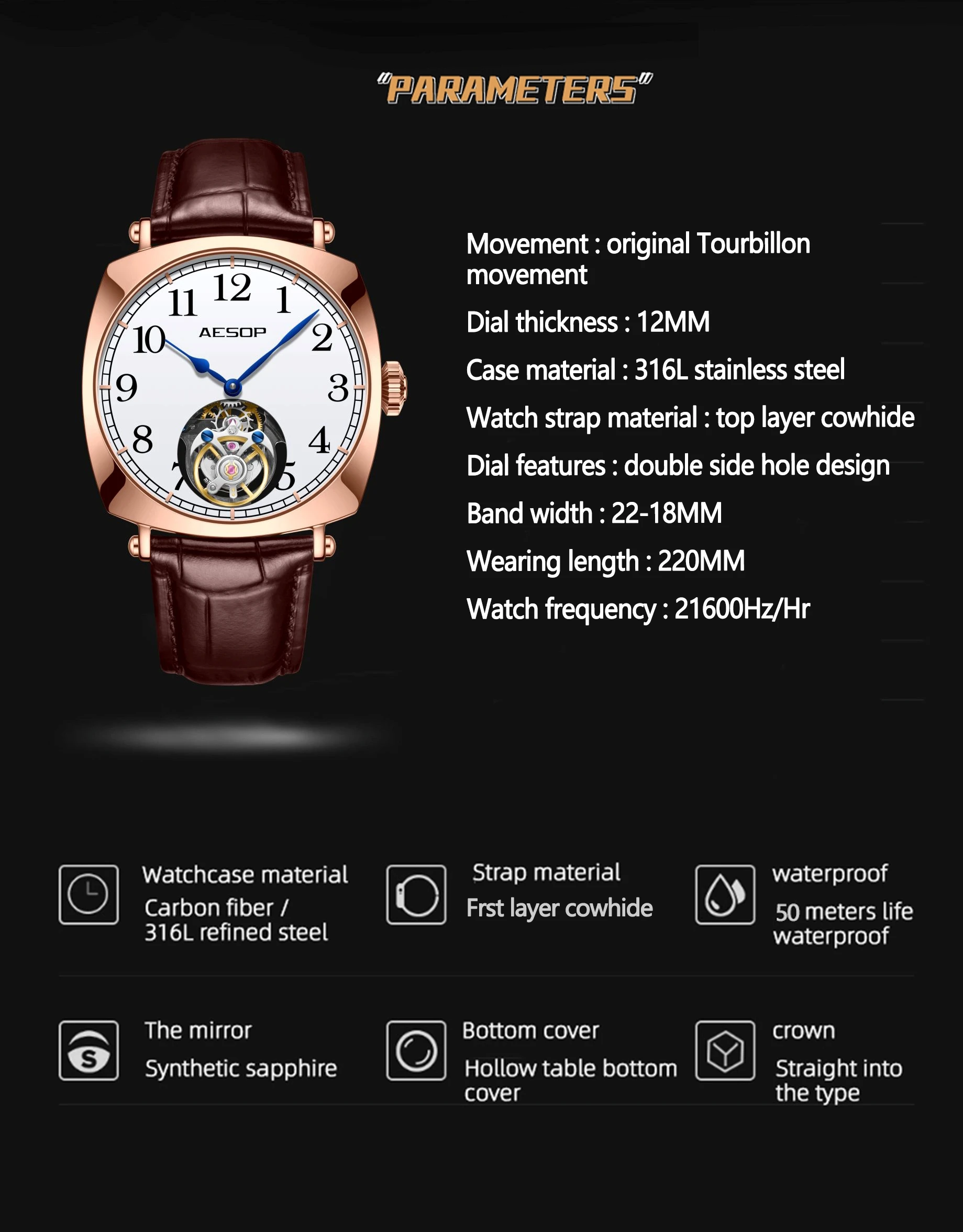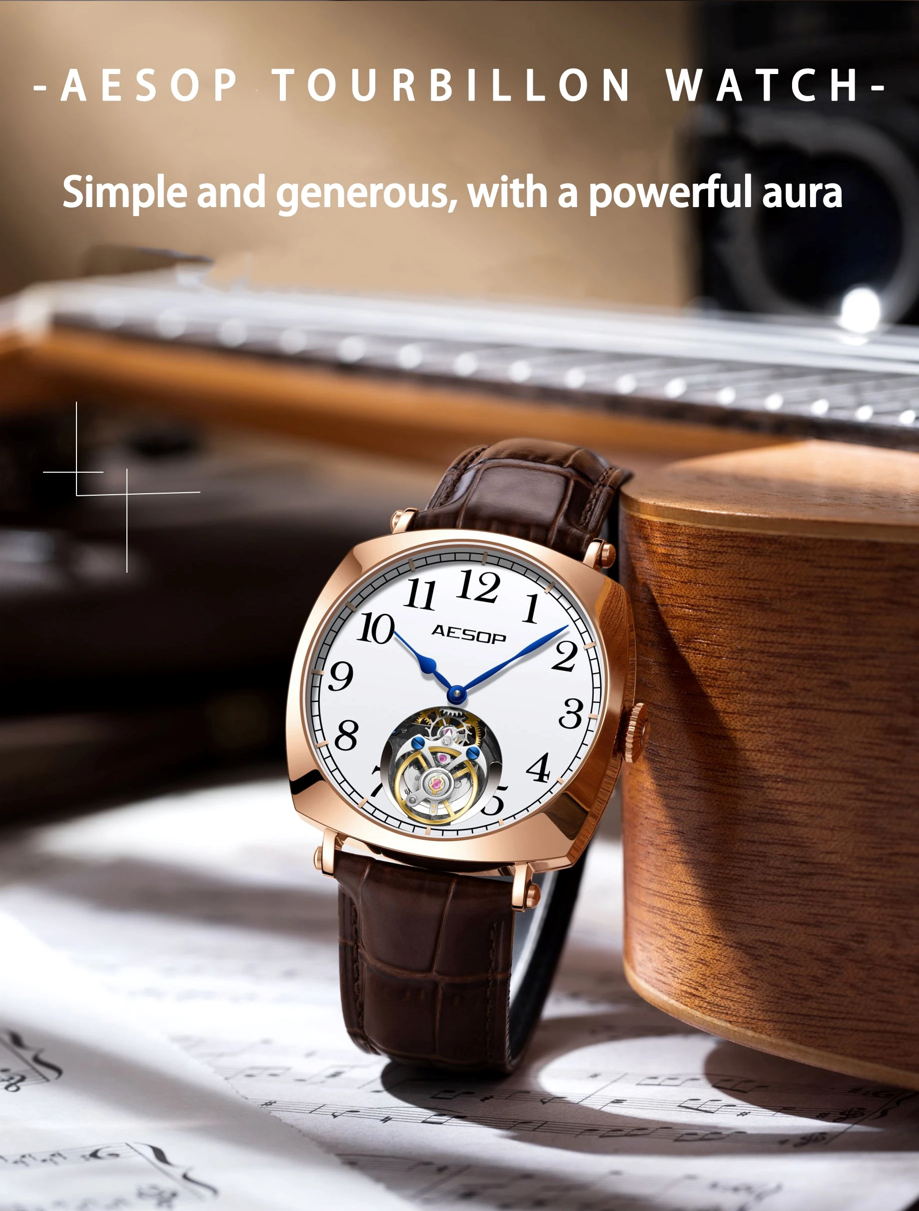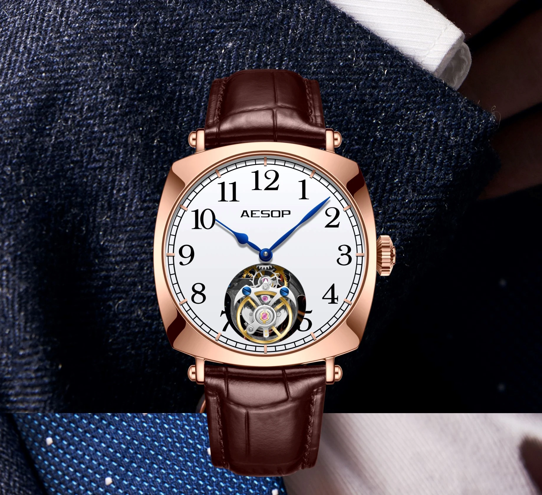 AESOP 7068 Flying Tourbillon Skeleton Watch – 41mm Square Sapphire Mechanical Luxury
