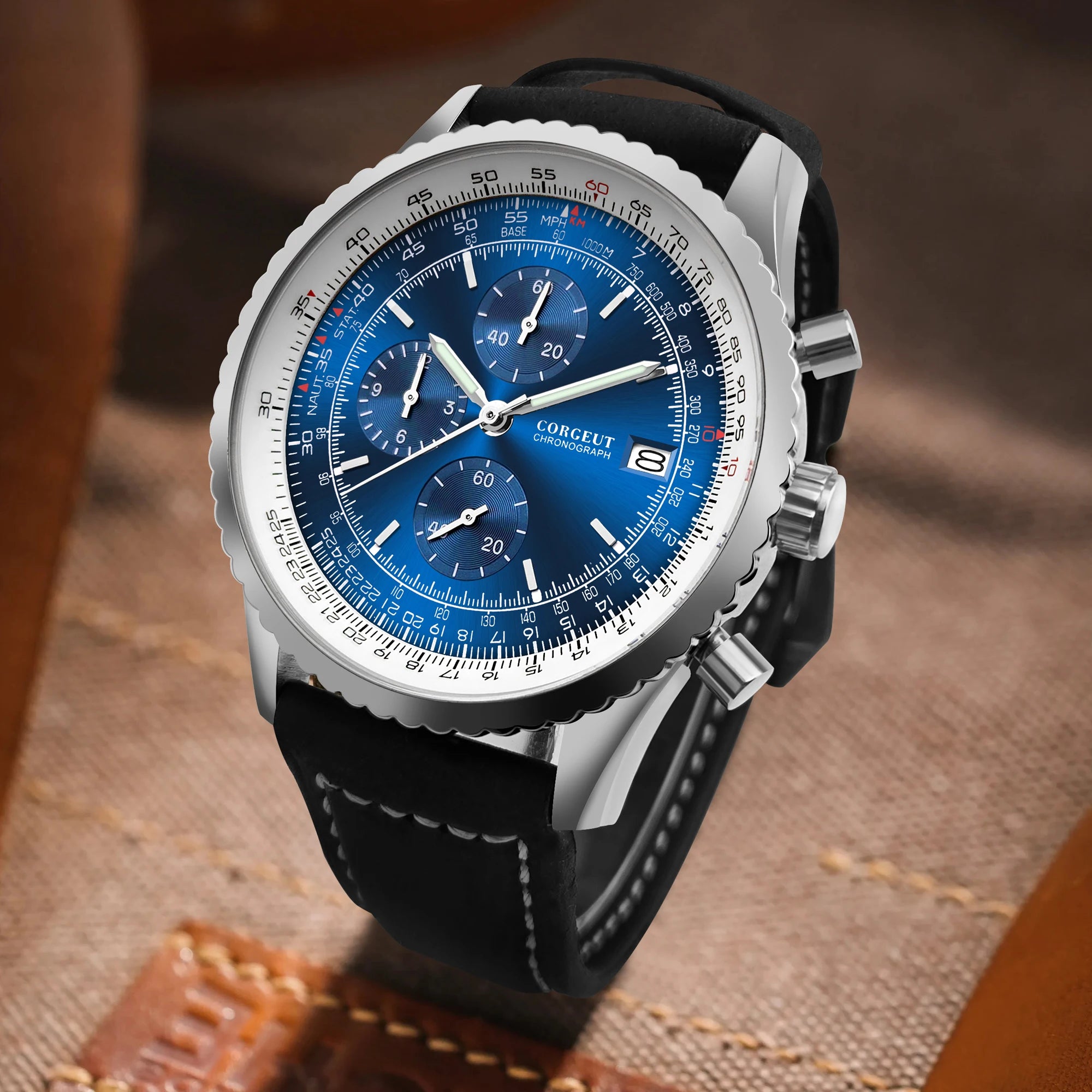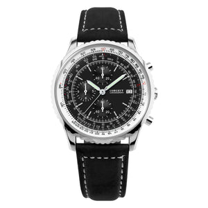 Presenting the Corgeut 9001 Air Chronograph – a robust and functional timepiece built for precision. Featuring a polished 46mm 316L stainless steel case and a reliable VK67 meca-quartz movement, it offers smooth chronograph operation. The screw-lock crown ensures security, while luminous hands provide excellent low-light visibility. Complete with a comfortable leather strap and impressive 10ATM water resistance, this watch is ready for any adventure.