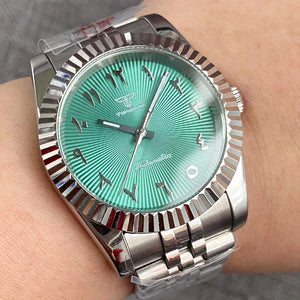 Elevate your wrist game with the Tandorio TD136A DateJust Mod, a classic timepiece featuring Arabic numerals for a distinctive touch. Available in 36mm or 39mm, this watch boasts a solid 316L stainless steel case, sapphire crystal, and a reliable Miyota 8215 automatic movement. With 20ATM water resistance and a premium stainless steel bracelet, it delivers timeless style and everyday durability.