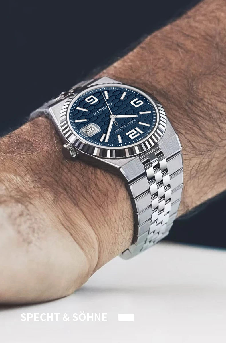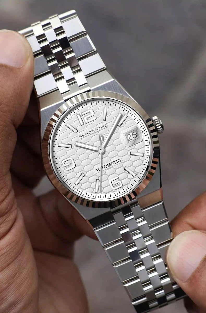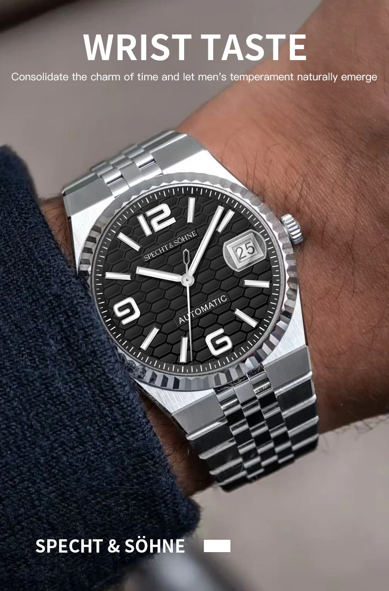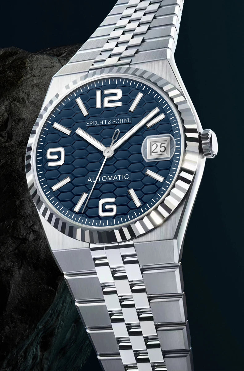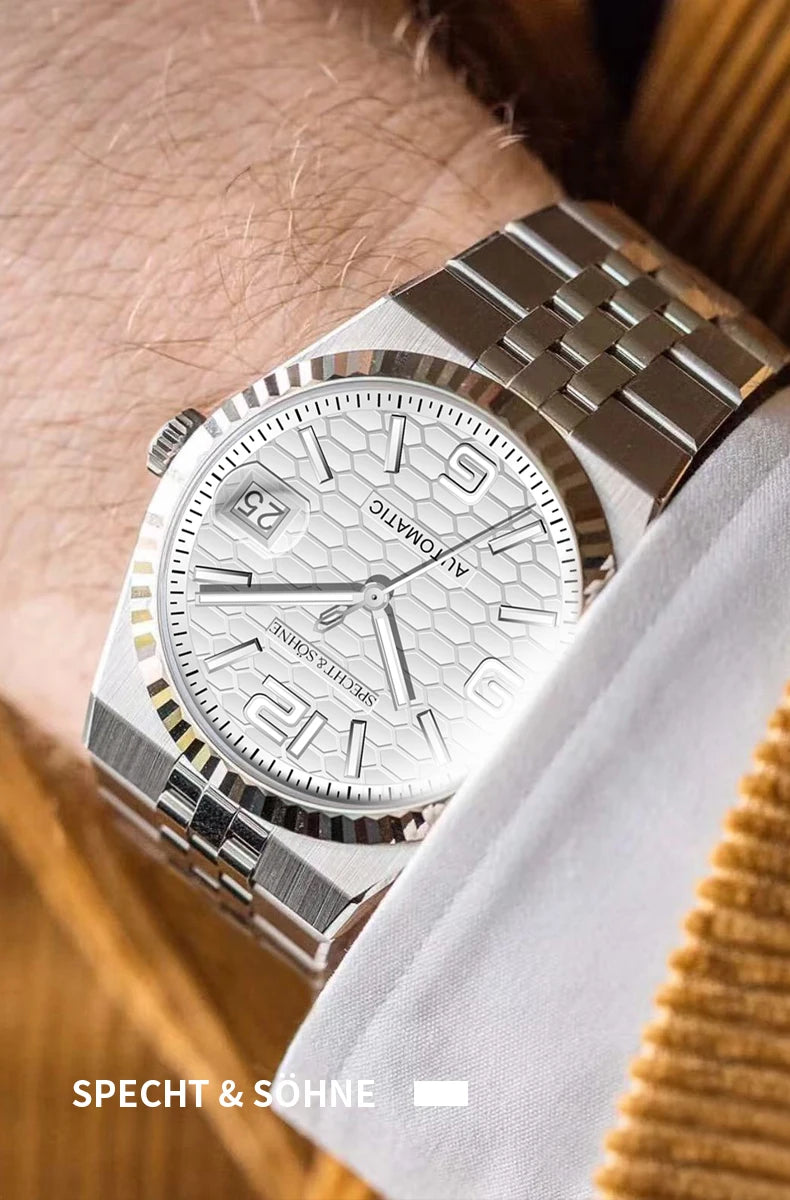 バランスの取れた手首の存在感を追求した、シュペヒト&ゾーネの37mm自動巻きデイトジャストウォッチは、薄型ベゼルと30.5mmの文字盤により、より大きく着用でき、洗練されながらもスポーティな印象を与えます。15.5~ 19cmの手首に理想的で、日本の精密機械と最高級素材を融合させ、日常のラグジュアリーを演出します。