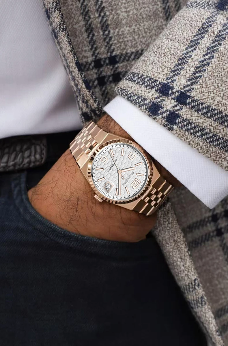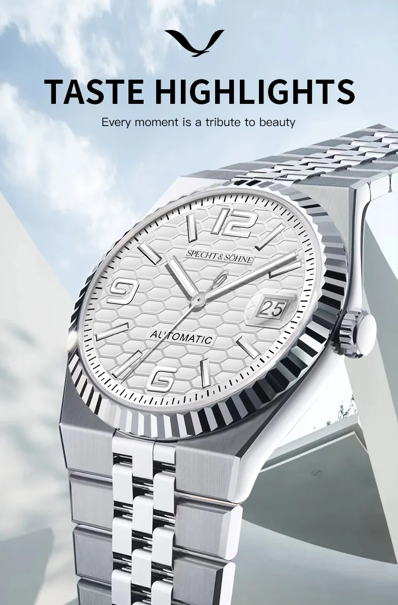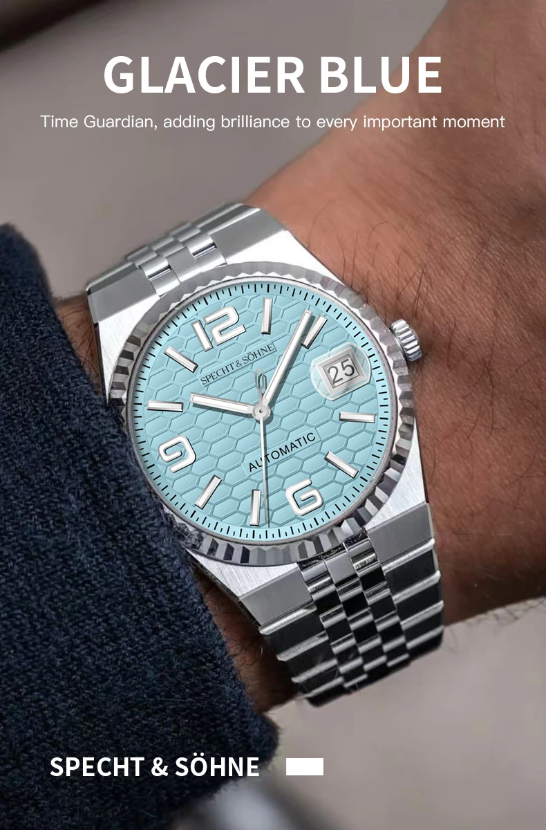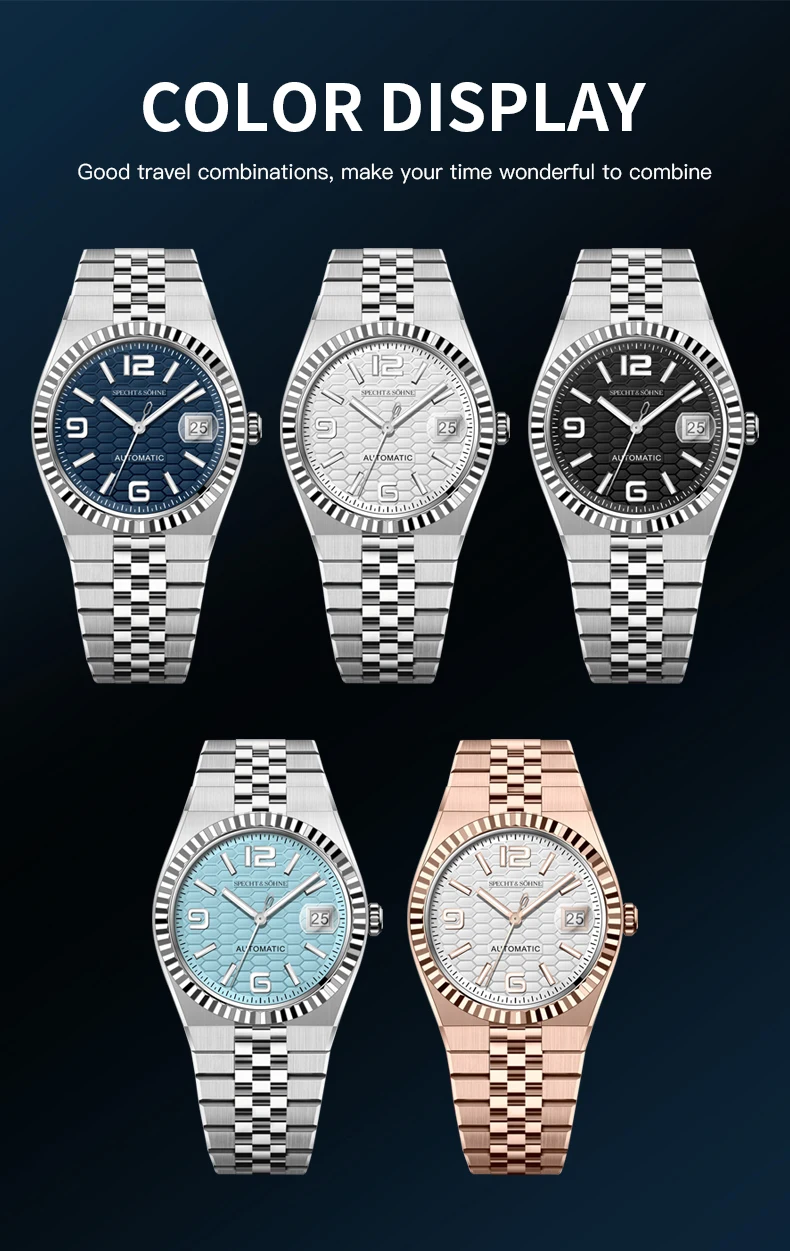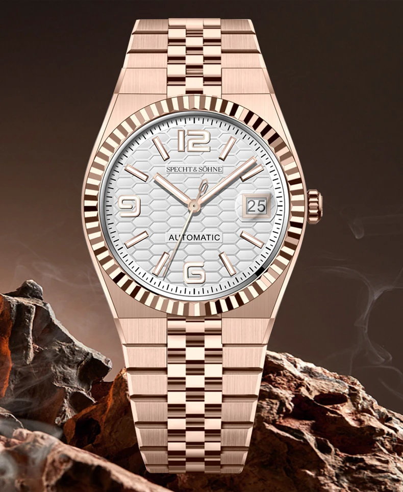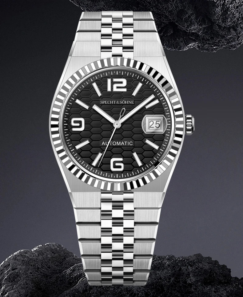 バランスの取れた手首の存在感を追求した、シュペヒト&ゾーネの37mm自動巻きデイトジャストウォッチは、薄型ベゼルと30.5mmの文字盤により、より大きく着用でき、洗練されながらもスポーティな印象を与えます。15.5~ 19cmの手首に理想的で、日本の精密機械と最高級素材を融合させ、日常のラグジュアリーを演出します。