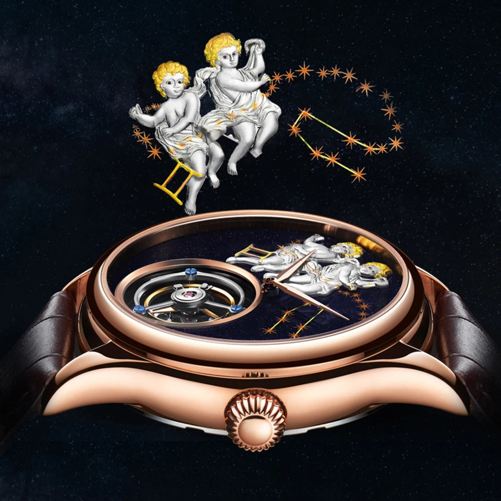 Experience the pinnacle of horological artistry with the AESOP 7003 Flying Tourbillon. This timepiece features a genuine flying tourbillon movement, a complex mechanism originally invented in 1795 to counter gravity and enhance precision, often regarded as the "king of watches." The double-sided hollow dial offers a captivating view of the intricate skeletonized movement, protected by a durable sapphire crystal. Encased in polished stainless steel and finished with a comfortable first-layer cowhide strap, this watch combines centuries-old watchmaking tradition with modern reliability.