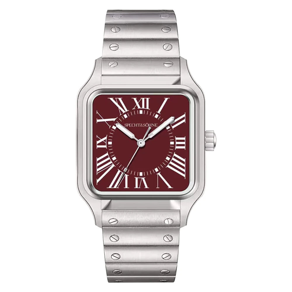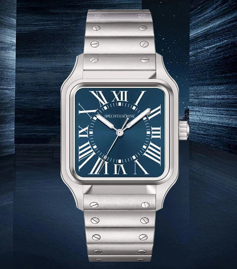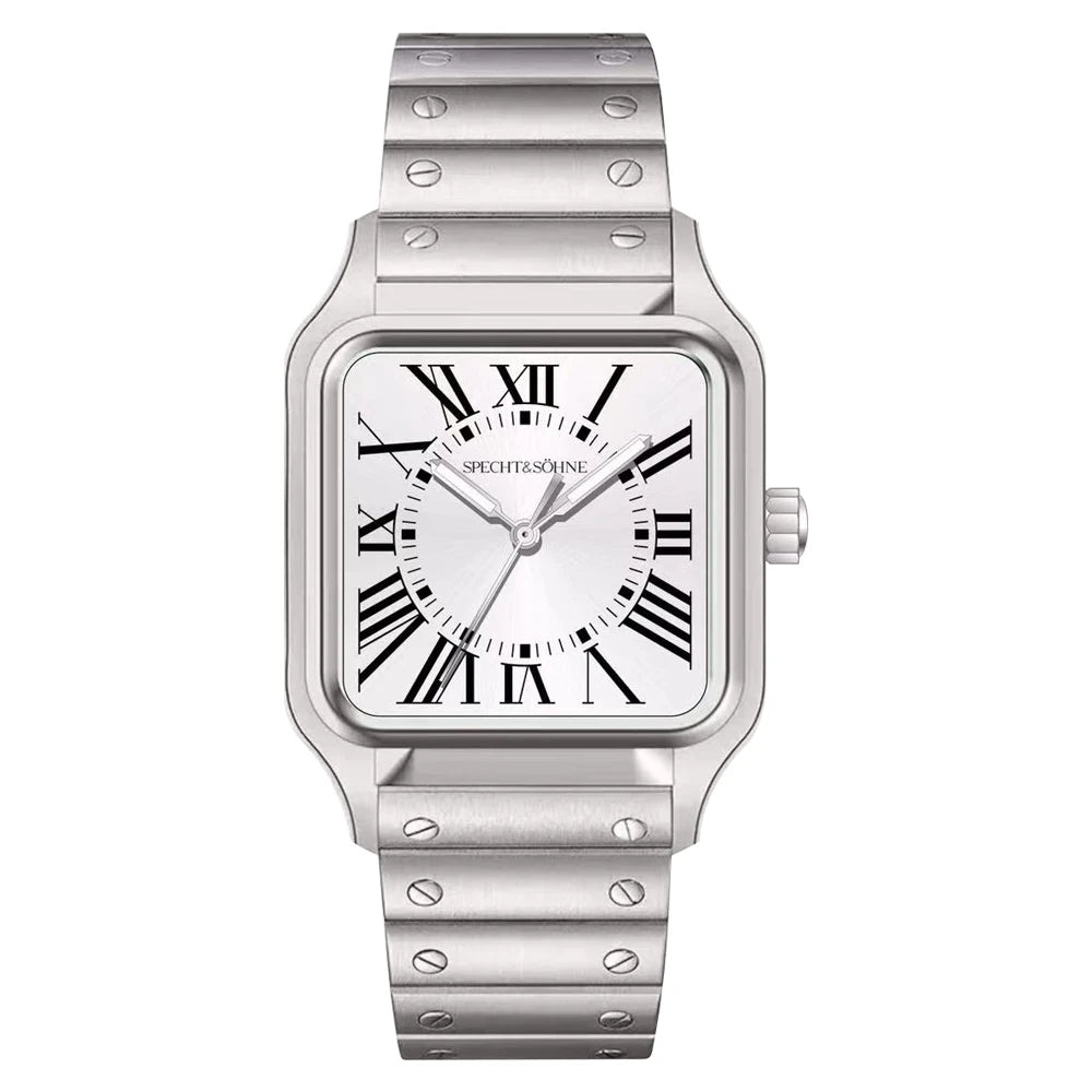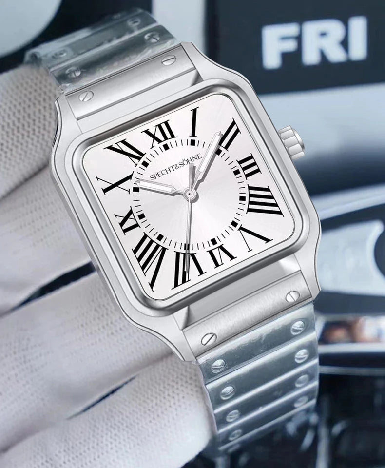 このSpecht & Söhneのクォーツスクエアウォッチは、クラシックなスクエアケースデザインとスリムでモダンなプロファイルを融合しています。信頼性の高い日本製クォーツムーブメントVH31を搭載し、正確な時刻表示、強力な夜光塗料、そして5気圧防水を実現しています。サファイアクリスタルと堅牢な316Lステンレススチール製の構造により、普段使い、ビジネス、カジュアルなスタイルに最適です。
