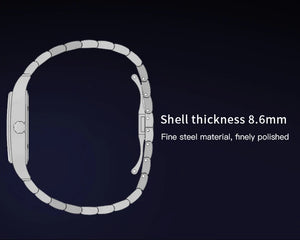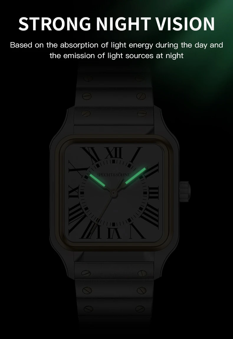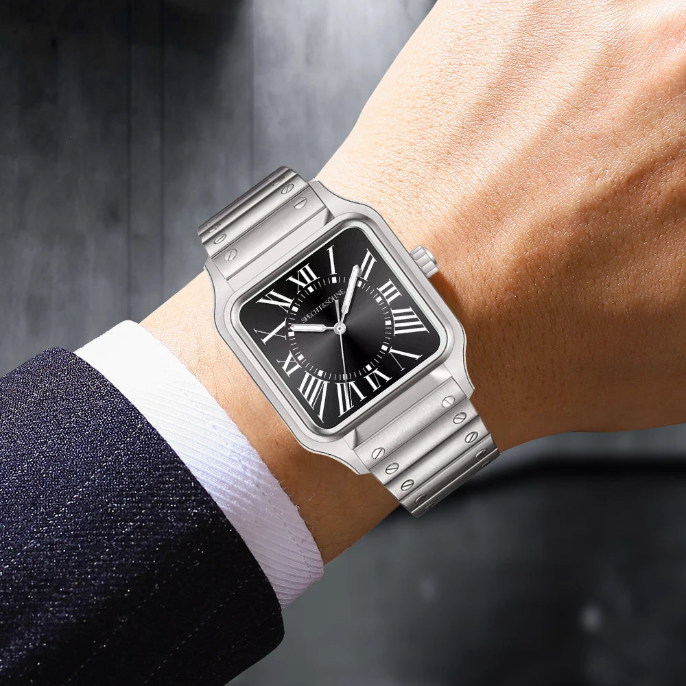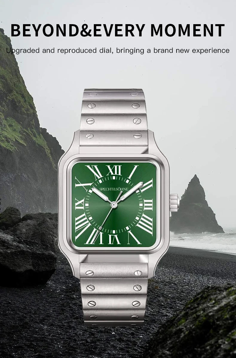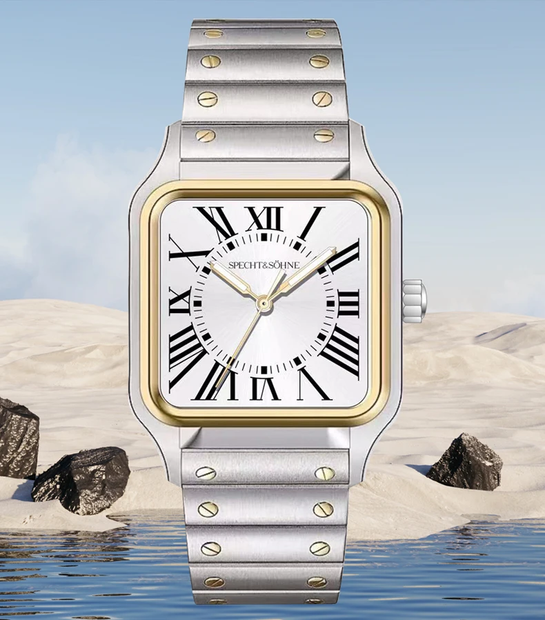 このSpecht & Söhneのクォーツスクエアウォッチは、クラシックなスクエアケースデザインとスリムでモダンなプロファイルを融合しています。信頼性の高い日本製クォーツムーブメントVH31を搭載し、正確な時刻表示、強力な夜光塗料、そして5気圧防水を実現しています。サファイアクリスタルと堅牢な316Lステンレススチール製の構造により、普段使い、ビジネス、カジュアルなスタイルに最適です。