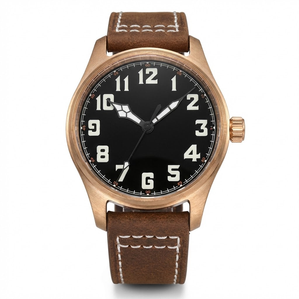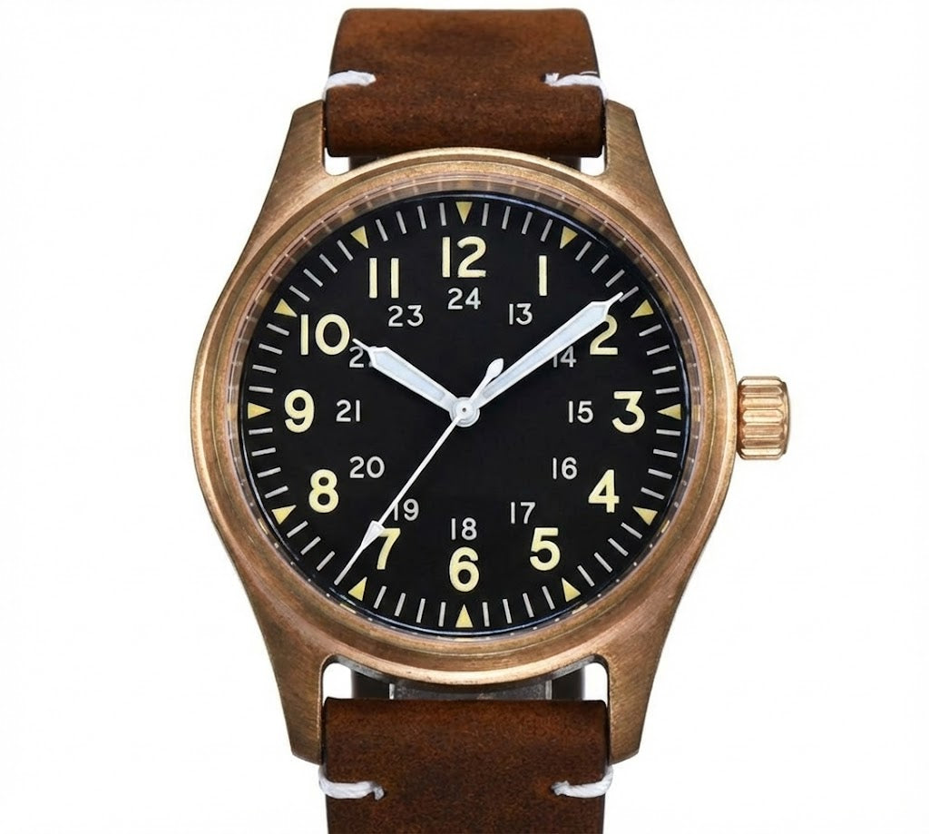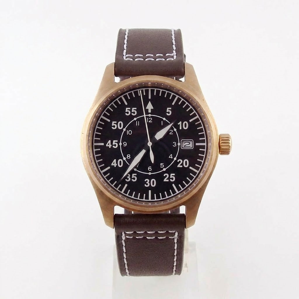 タンドリオ CUSN8 ブロンズ パイロットウォッチは、最高級の素材と信頼性の高いメカニズムを融合させ、ツールウォッチとしての大胆な個性を放ちます。堅牢なCUSN8ブロンズケースは、時を重ねるごとに独特の風合いを増し、一点一点が唯一無二の時計へと昇華します。信頼性の高い日本製NH35自動巻きムーブメントを搭載し、サファイアクリスタルガラスで保護されたこのモデルは、優れた視認性、耐久性、そして20気圧防水を誇り、日常使いにも、航空にインスパイアされたコレクションにも最適です。