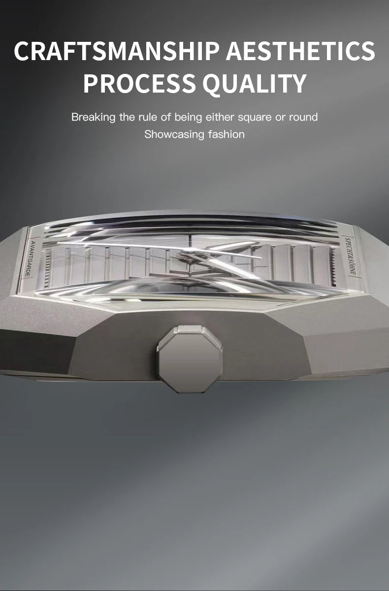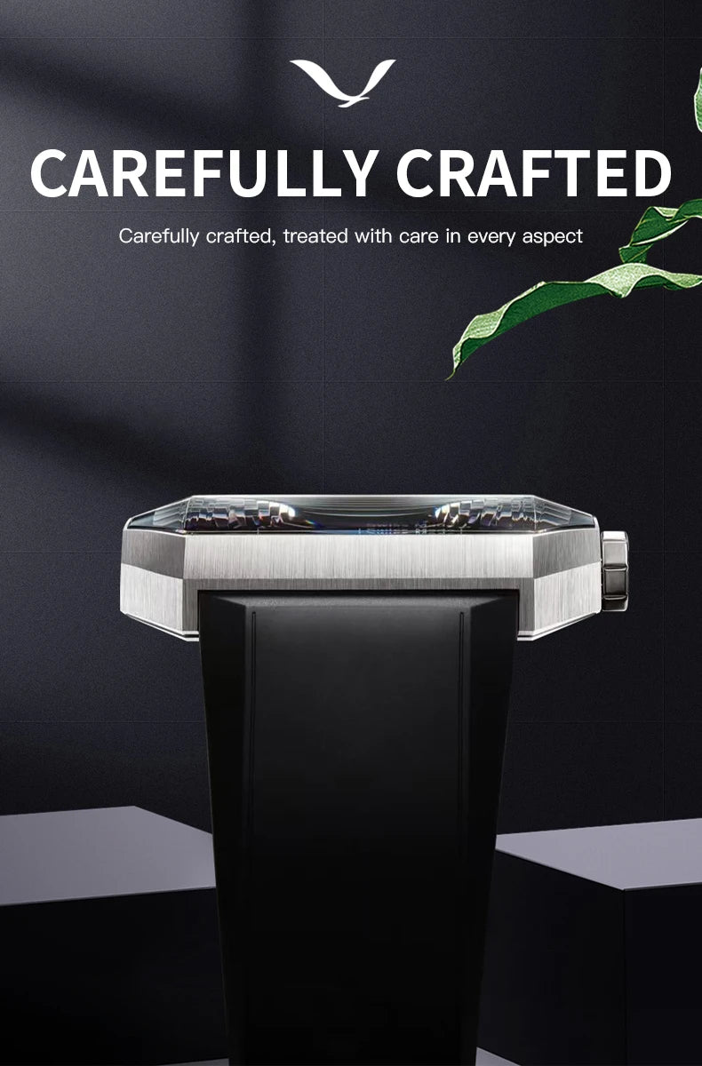 A bold octagon sports watch with a distinctive Egyptian pyramids dial, combining modern geometry with luxury detailing. Powered by the Japan VH31 sweep-second quartz movement, featuring a 3D sapphire crystal and upgraded V2 rubber strap for enhanced comfort and durability.