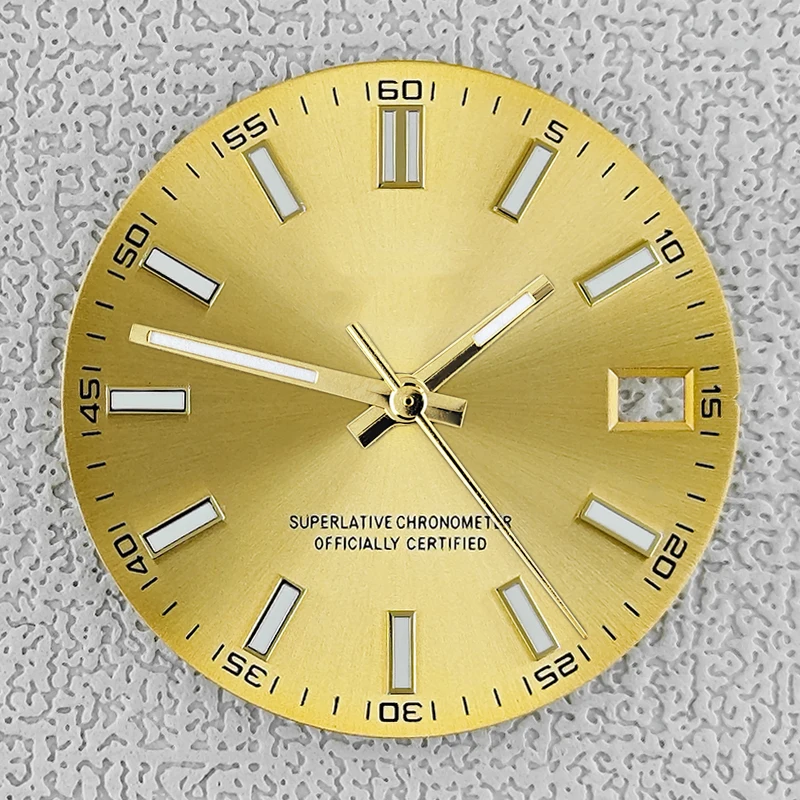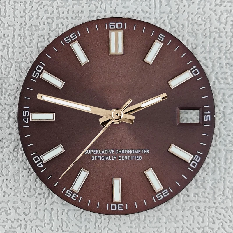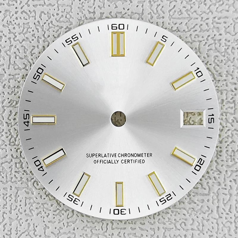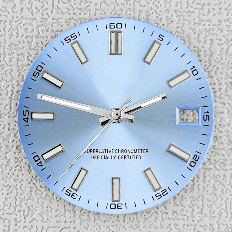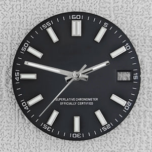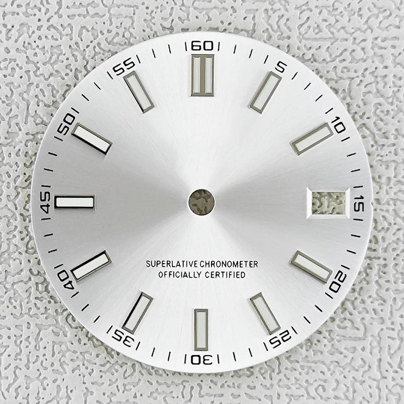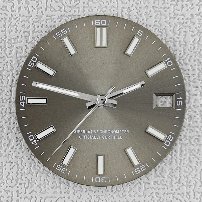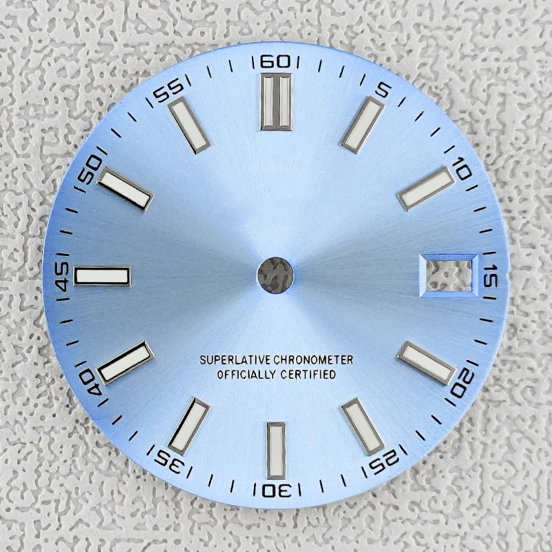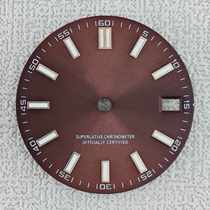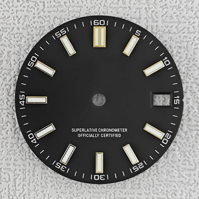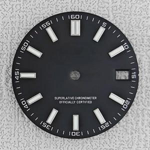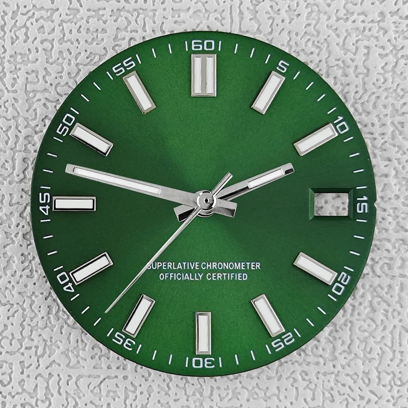 This 28.5mm watch dial features a double bar date window designed for NH35 and NH36 automatic movements. Its sunray finish enhances readability and adds an elegant touch, while luminous hands ensure visibility in low light. Crafted for precision, this dial combines functionality and refined aesthetics, making it ideal for watch enthusiasts seeking a reliable and stylish upgrade for their automatic timepieces.