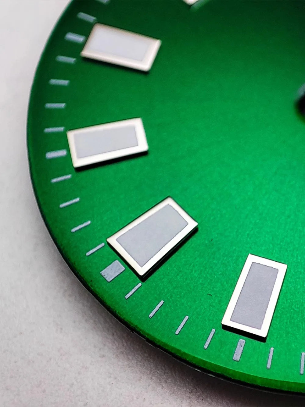 Expertly crafted 28.5mm green watch dial with a sterile surface and sun pattern, designed for use with the NH35 movement. Featuring a single calendar date and compatible with repair accessories, this dial adds a touch of elegance and function to any watch.