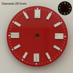 28.5mm NH35 Luminous Watch Dial – Grass Green / Red / Dark Blue / Yellow | Double Bar Markers | Logo Customization Available