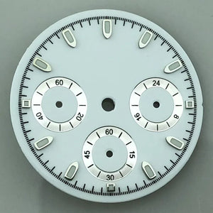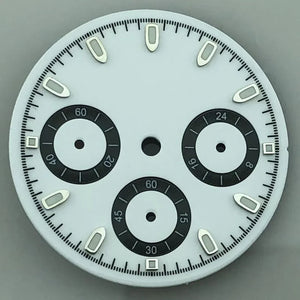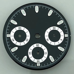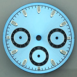 Build your perfect chronograph with this 29.8mm sterile VK63 dial. Featuring a clean, logo-free design with luminous hour markers, it fits VK63 quartz movements seamlessly. Available in multiple color options including Black, White, Gray, Blue, Gold, and Orange, this dial offers versatility for any custom project. Please note: There may be slight color differences between the picture and actual product due to monitor variations.