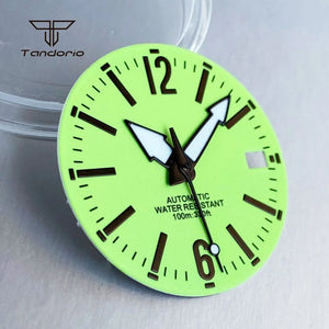 Enhance the style and functionality of your watch with our 29mm Green Watch Dial Full Luminous Face Hands Set. The luminous face and hands allow for clear time-telling even in low light conditions, while the date feature adds convenience. Compatible with NH35 automatic movements, this set is perfect for watch restoration or customization.