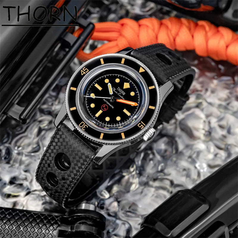 The Thorn T008 Vintage Diver reimagines the iconic Fifty-Fathoms design with modern precision. Its lightweight 38mm titanium case houses a high-beat PT5000 automatic movement. Featuring a stunning sapphire "pot cover" crystal, a luminous sapphire bezel, and an FKM vintage strap, this 200m timepiece offers exceptional durability, vintage charm, and tool-watch reliability in an ultra-wearable package.
