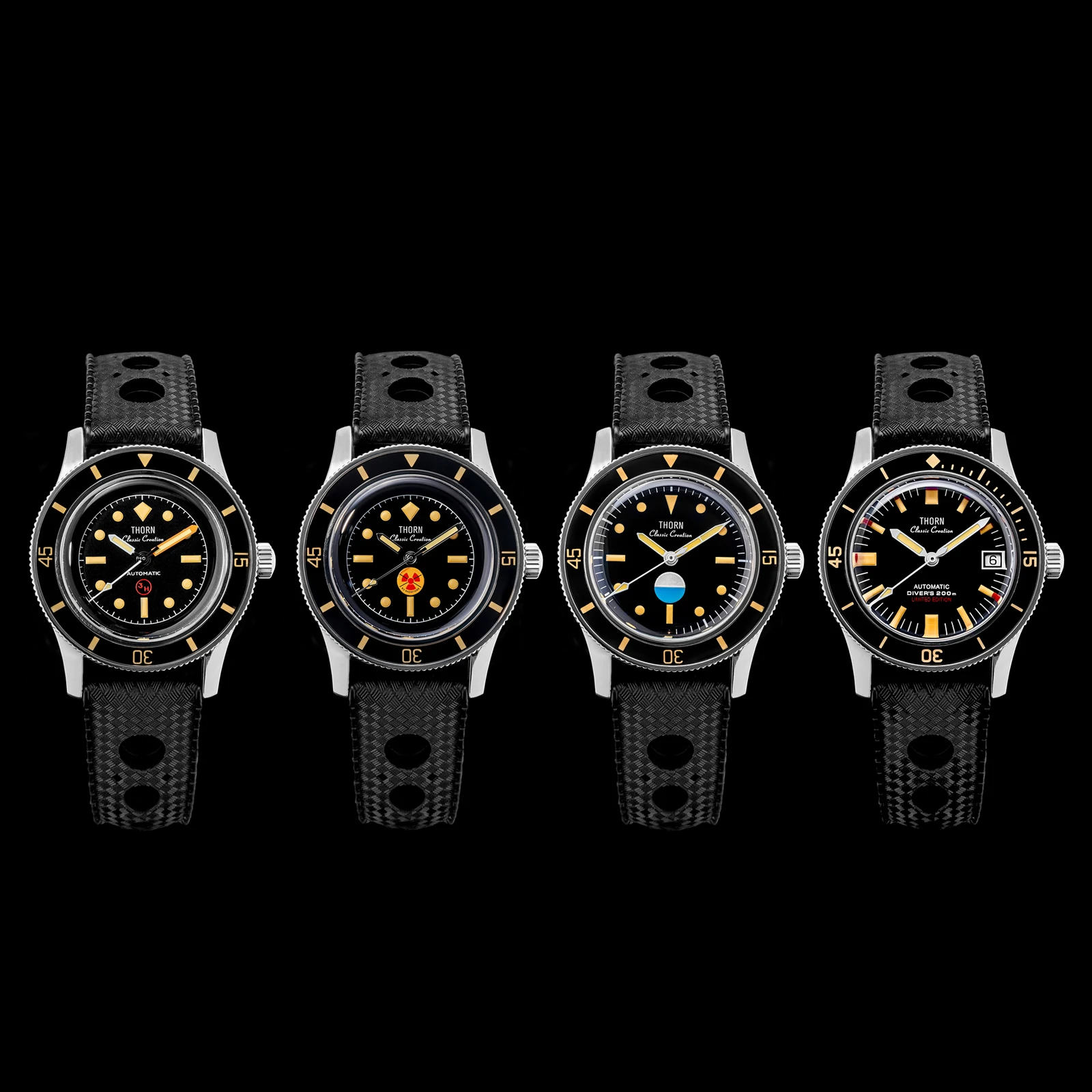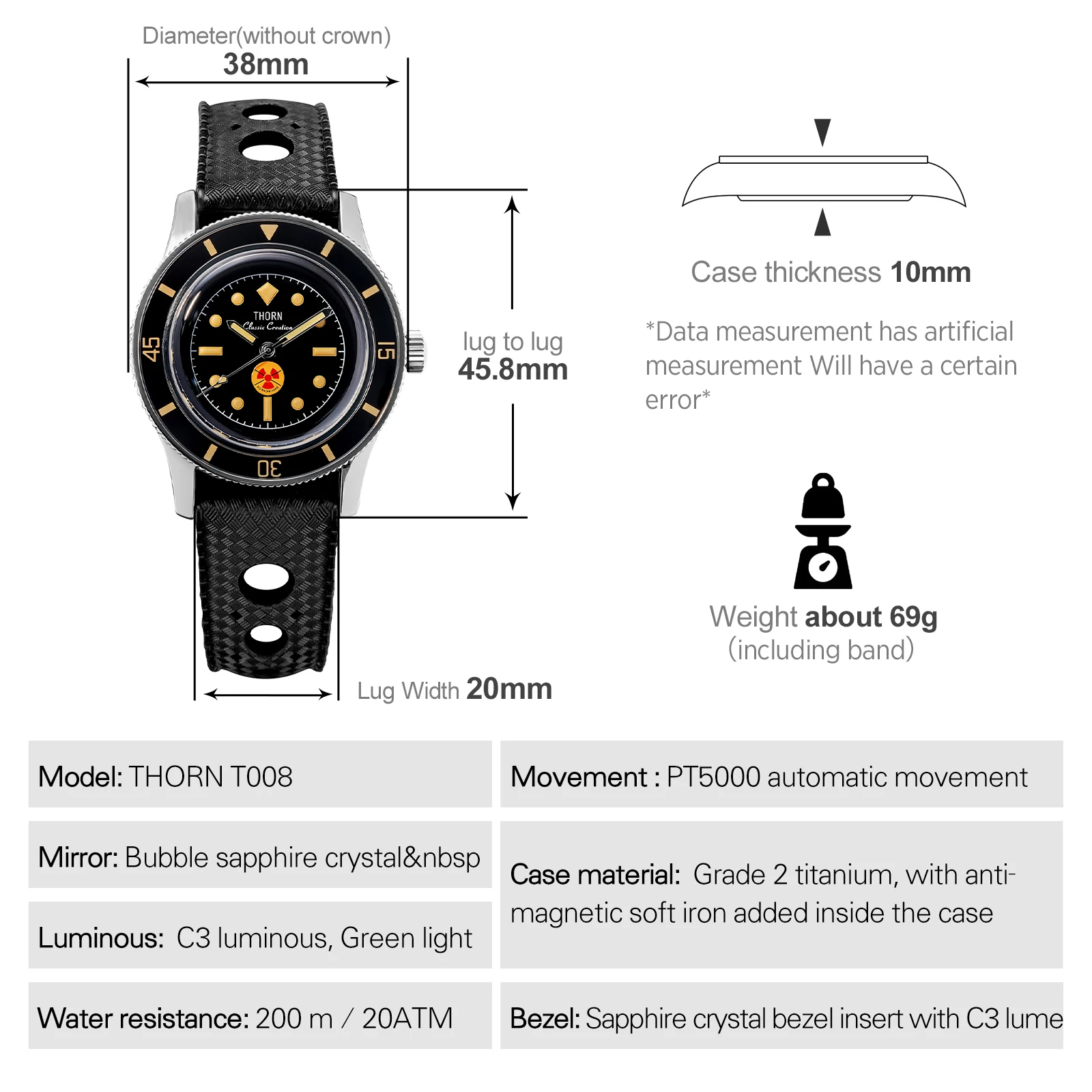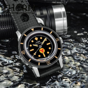 The Thorn T009 is a precision-crafted homage to the legendary Fifty-Fathoms, engineered for modern enthusiasts. Its 38mm Grade 2 titanium case weighs only 69g and houses a soft iron anti-magnetic cage. Powered by the high-beat PT5000 automatic movement, it features a dual-sapphire construction—bubble crystal and luminous bezel insert—and 200m water resistance. A true tool watch with vintage soul.