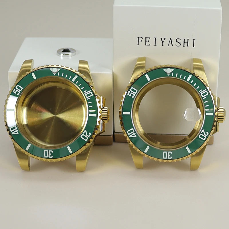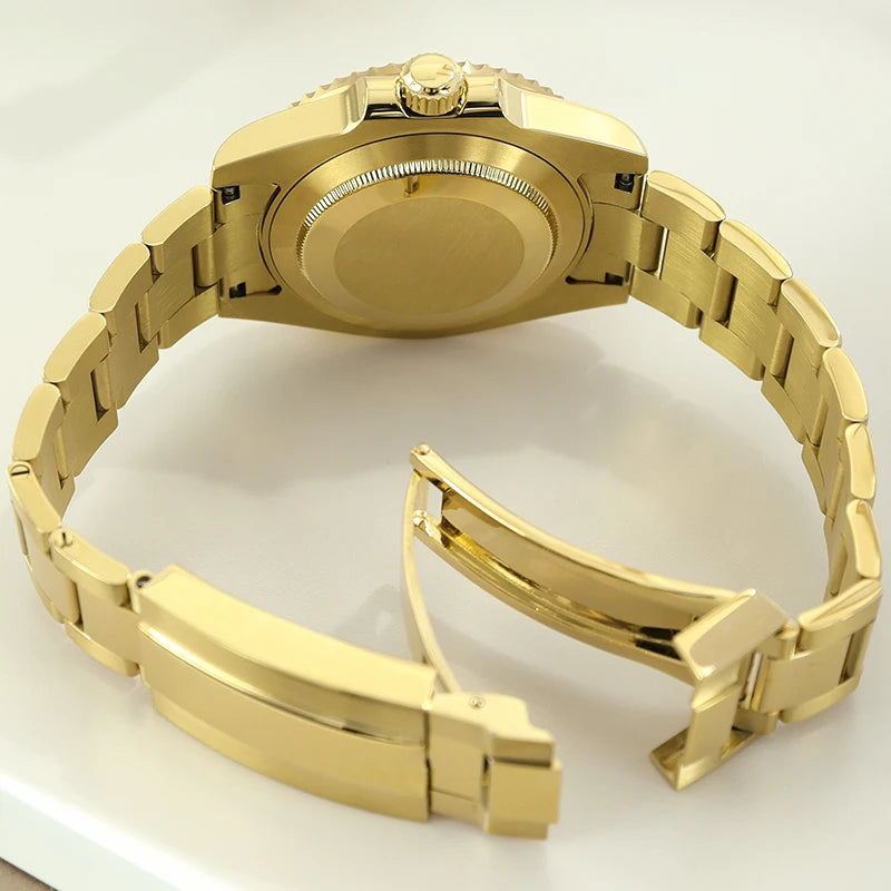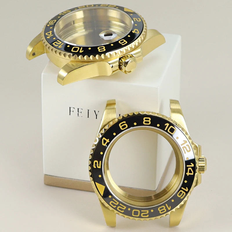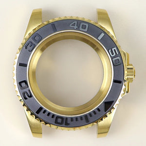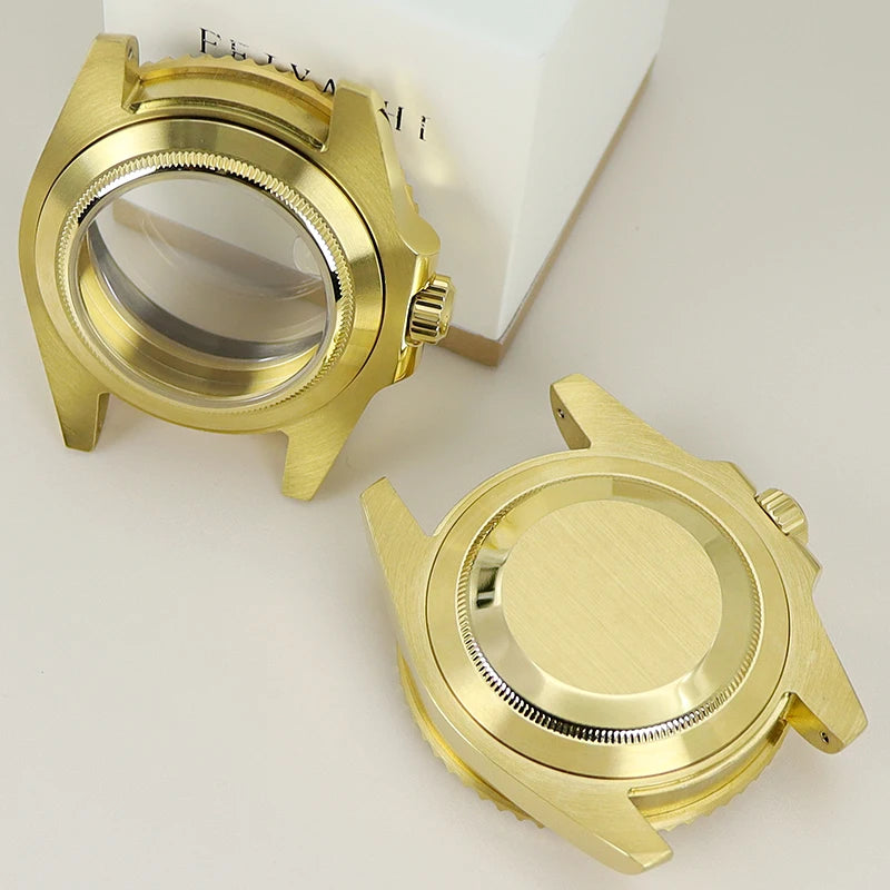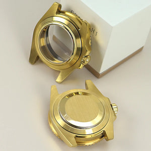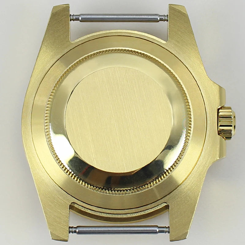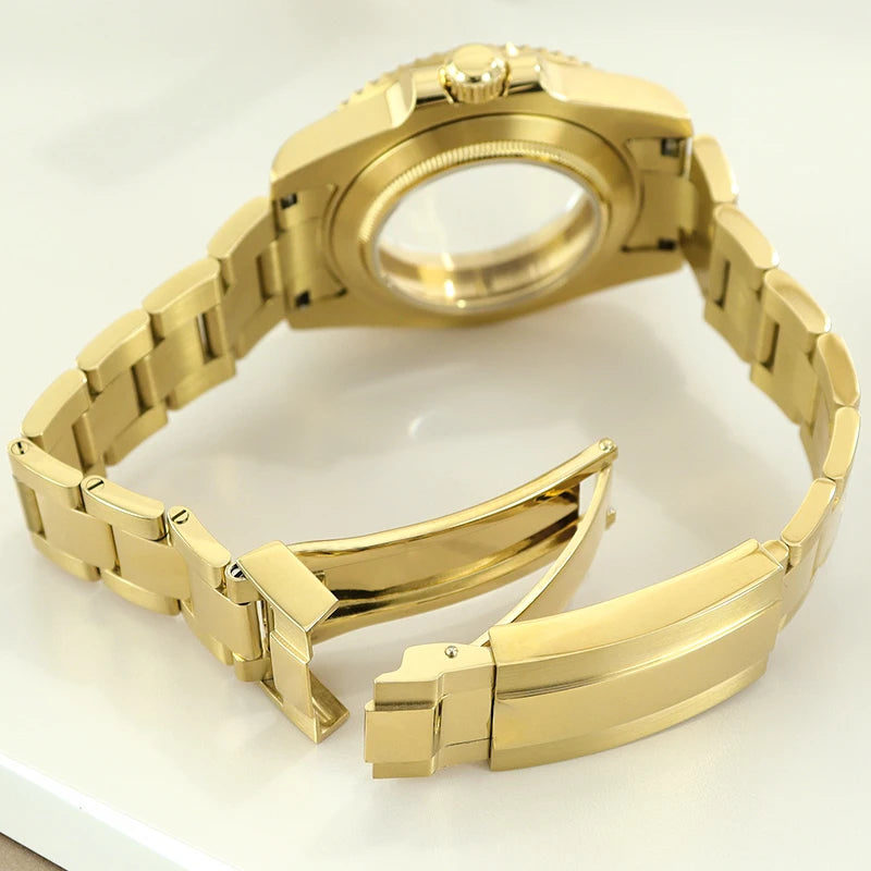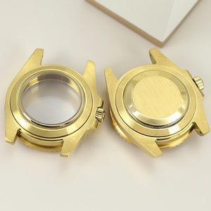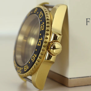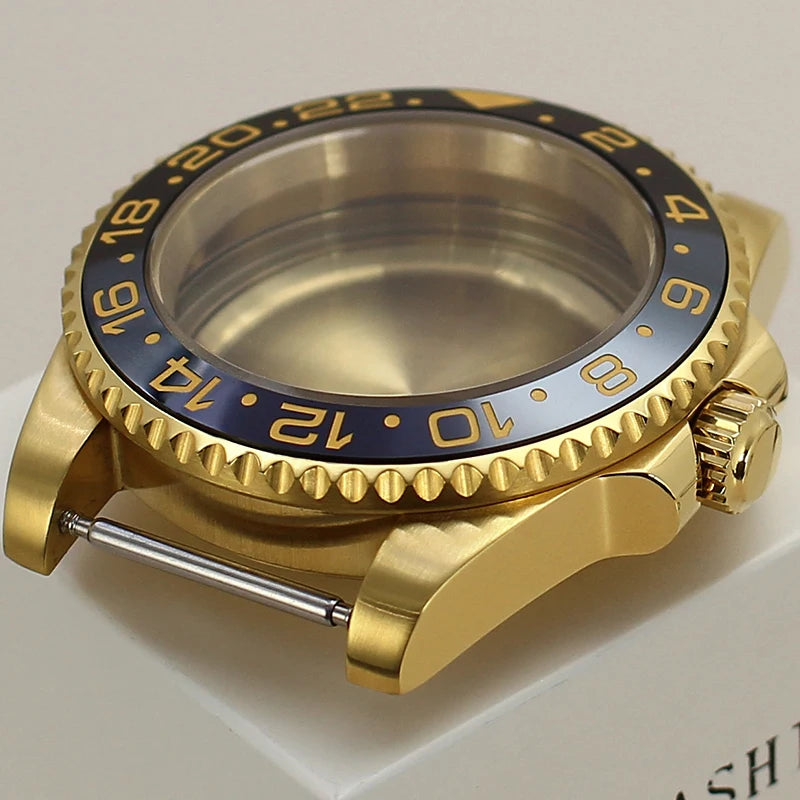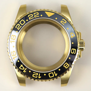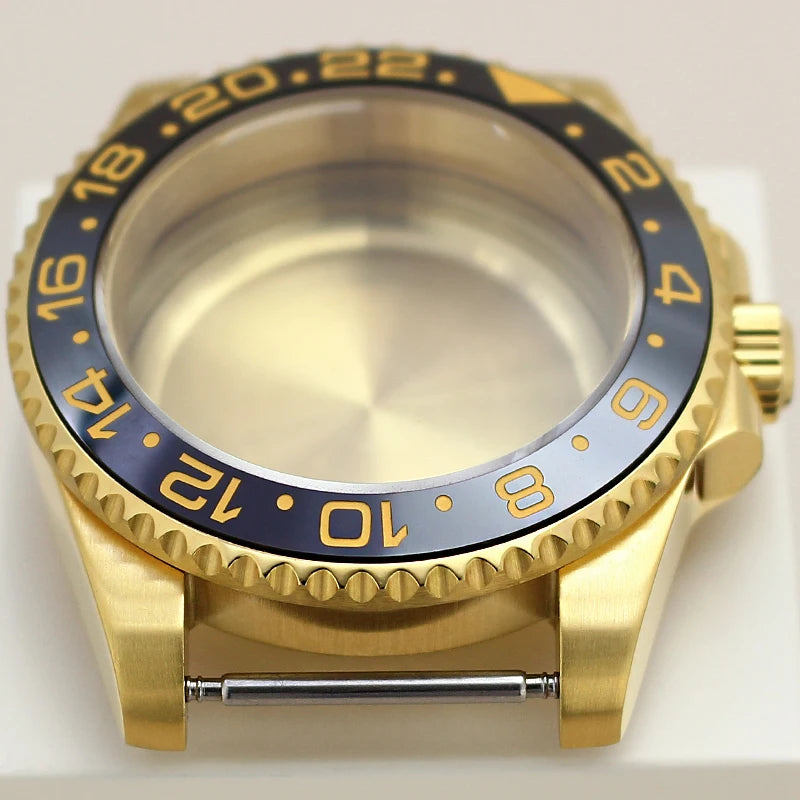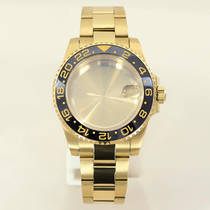 Premium 40mm PVD gold submariner watch case designed for professional watchmakers and modding enthusiasts. Crafted from solid 316L stainless steel with a durable PVD gold finish, this case features a GMT Yacht Master–inspired design, sapphire crystal, and 200m water resistance. Broad compatibility with NH35 / NH36 / NH34 GMT / NH38 / Miyota 8215 / ETA 2824 movements makes it ideal for custom GMT builds, upgrades, and restorations.