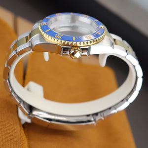 Precision-engineered 40mm watch case designed for professional watchmakers and enthusiasts. This two-tone submariner-style housing accommodates popular automatic movements including Seiko NH35, NH36, NH38, NH34, Miyota 8215, and ETA 2824. Features a robust sapphire crystal for scratch resistance, integrated GMT/diver bezel functionality, and a matching two-tone bracelet. The 28.5mm dial opening ensures perfect fit for standard watch faces. Ideal for custom builds, repairs, or creating bespoke timepieces with reliable case construction and refined aesthetics.