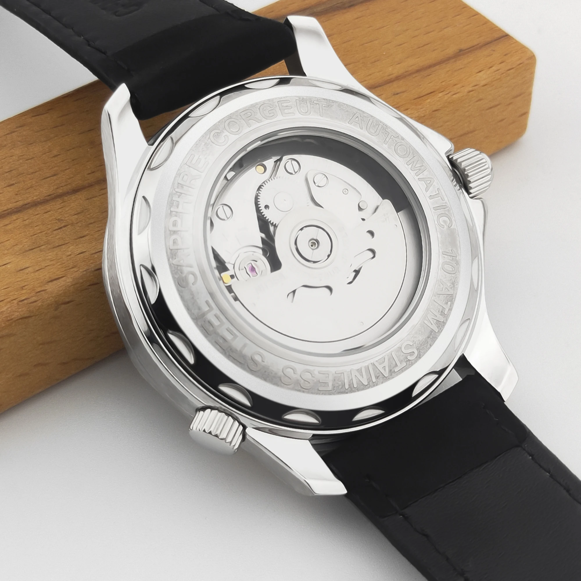 The CORGEUT Seamaster 300 Mod combines vintage dive watch aesthetics with modern reliability. Powered by the Seiko NH35 automatic movement, it features a 41mm polished 316L stainless steel case, flat sapphire crystal, and unidirectional ceramic bezel. Available in white, blue, or black sunburst dials with C3 green luminous markers. Custom logo accepted. Water-resistant to 50 meters.