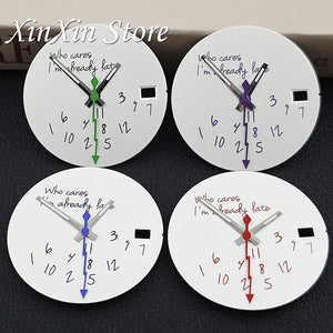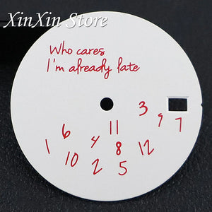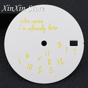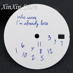 Bold and humorous dial layout with the text “Who Cares, It’s Already Late” paired with lightning-style seconds hand compatibility—perfect for fun, creative watch builds.