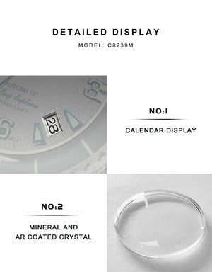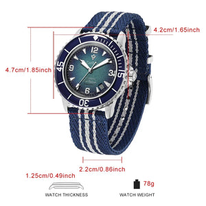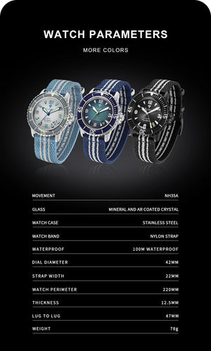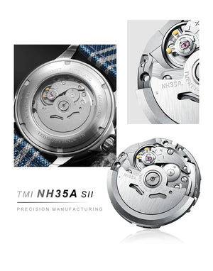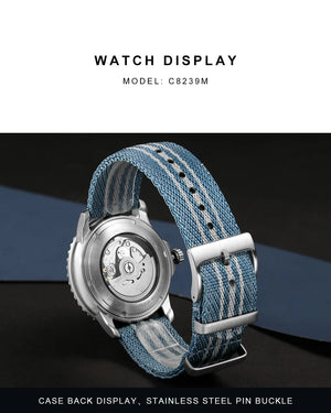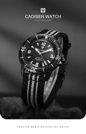 The CADISEN BB58 Watch C8239 Automatic Mechanical is a perfect blend of performance and elegance. Powered by the Japanese Miyota 8215 self-winding movement, this watch ensures reliable timekeeping without manual winding. Crafted with a durable canvas strap, stainless steel case, and AR-coated mineral crystal, it offers a classic design that is both functional and stylish. Featuring a 10Bar water resistance, luminous hands, and a complete calendar function, this timepiece is ready for any occasion, including swimming and diving.