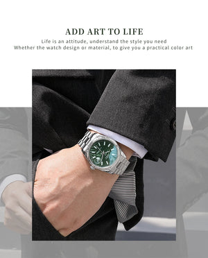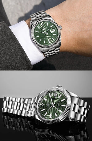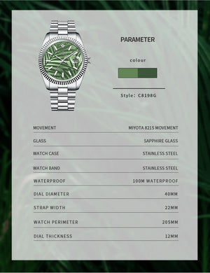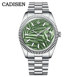 Introducing the Cadisen C8198 DateJust watch featuring a stunning olive green palm motif design. With its 10bar dress sapphire and reliable Miyota 8215 movement, this 40MM timepiece combines style and functionality. Perfect for any occasion, experience the luxury of Cadisen.