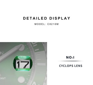 Expertly crafted to impress, the CADISEN C8216 Submariner Diver boasts a durable NH35A movement and scratch-resistant AR Sapphire. With bright BGW9 lume and a 20Bar water resistance, it's perfect for any diving adventure. Upgrade your timepiece collection today.