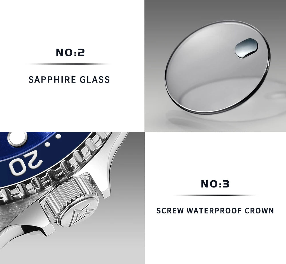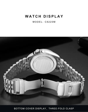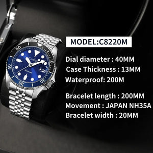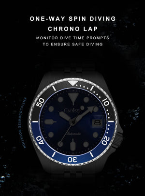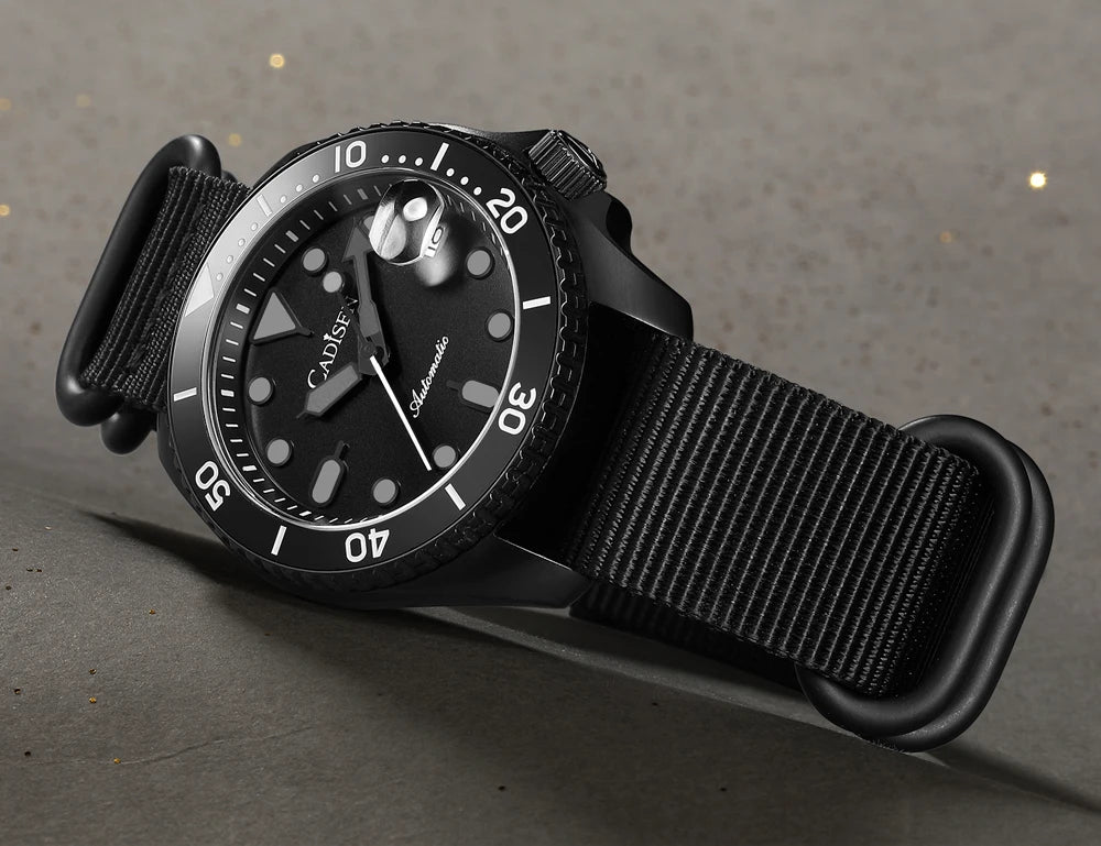 The CADISEN C8220 combines traditional watchmaking with modern dive watch specifications. Its automatic mechanical movement operates independently without battery dependency, while the ceramic rotating bezel enables accurate dive timing and decompression calculations. Sapphire crystal glass provides superior scratch resistance and optical clarity essential for underwater readability. Luminous hour markers and hands glow reliably in darkness, critical for deep-water navigation. The lightweight nylon band offers flexibility and quick-drying properties ideal for aquatic environments. This timepiece balances technical precision with everyday wearability, making it a versatile choice for divers and watch collectors alike.