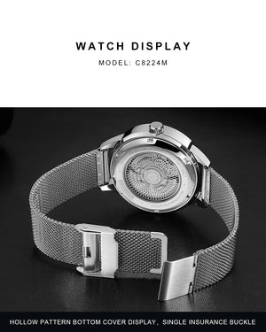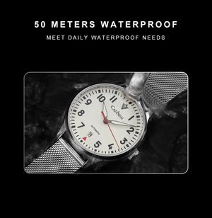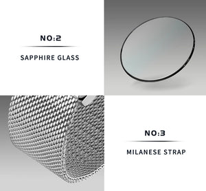 With a 5ATM (50M) water resistance, it withstands splashes and brief immersion. The stainless steel Milanese mesh strap ensures a comfortable and secure fit with a folding clasp with safety.