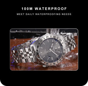 Self-winding mechanical movement ensures precision timekeeping without manual adjustments. -