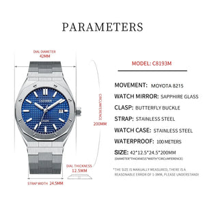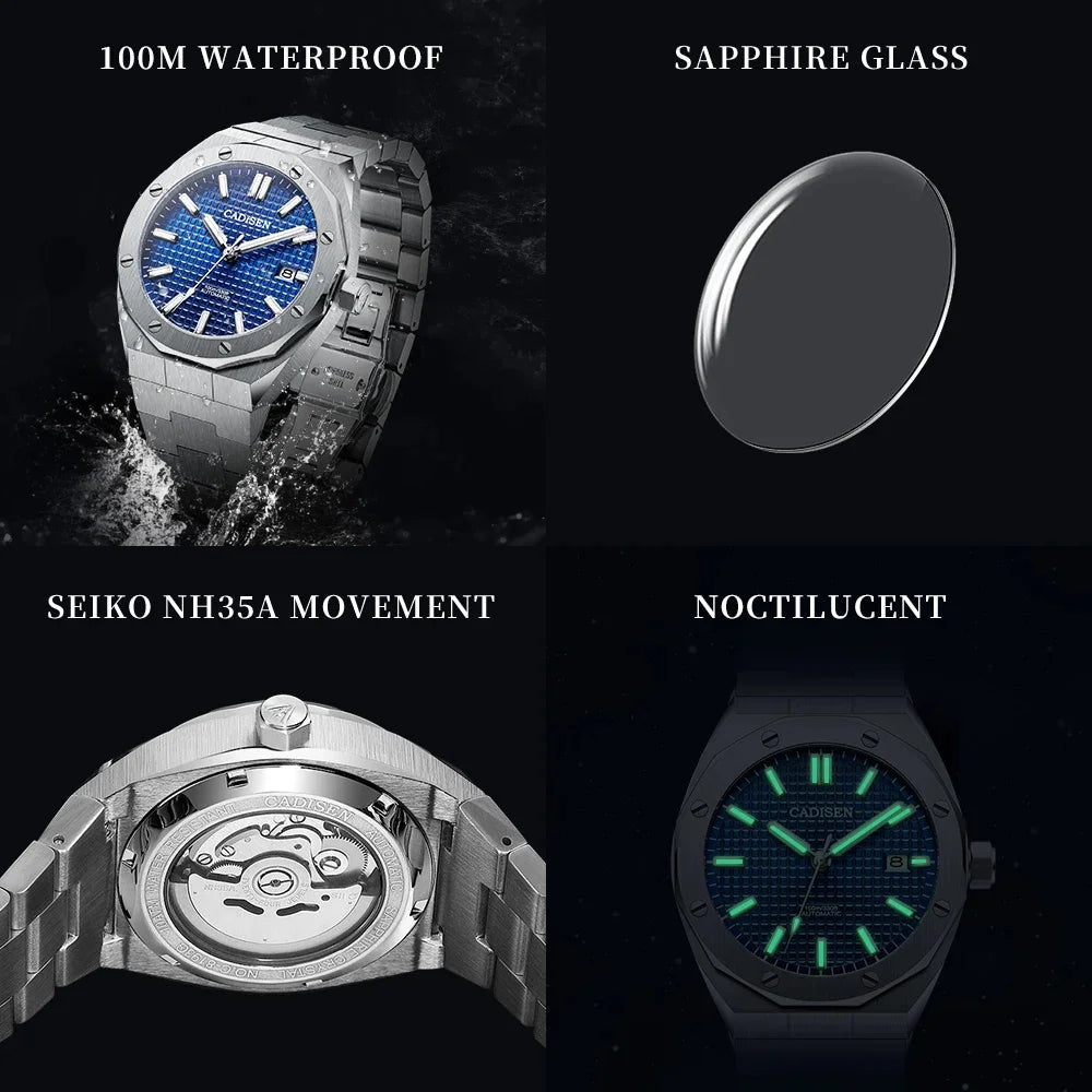The Cadisen Royal Oak C8193 is a mechanical masterpiece that combines elegance with practicality. Powered by the reliable Japan NH35A automatic movement, this watch ensures precise timekeeping while exuding luxury through its 316L stainless steel case and band. Designed for both formal and casual occasions, its sapphire crystal offers enhanced durability, and its 100-meter water resistance makes it suitable for everyday adventures.