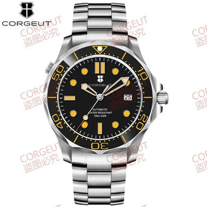 Discover the Corgeut 2023 Mechanical Wristwatch, a stylish and functional timepiece designed for men. This watch features the NH35 automatic self-wind movement, known for its reliability and precision. The 40mm stainless steel case, with a thickness of 13mm, is crafted from high-quality 316L precision steel and features a polished finish. The dial is numberless, with a white, blue, or black surface that emits green light in low light conditions. The ceramic bezel offers unidirectional rotation, making it suitable for diving and other water activities. With a 5Bar (50m) waterproof rating, this watch is perfect for daily use, handwashing, and swimming.