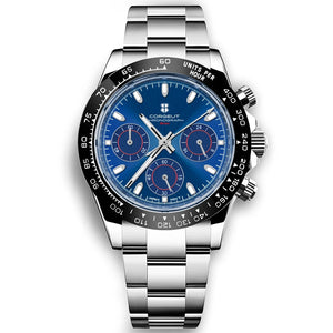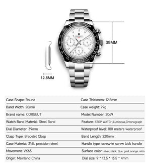 The Corgeut 2069 is a stylish and functional quartz chronograph wristwatch, designed for precision and everyday wear. Powered by a Japanese VK63 movement, it offers a full chronograph function with multiple time zones. The 39mm stainless steel case is paired with a scratch-resistant Hardlex crystal for durability. With 5Bar water resistance, luminous markers, and a 20mm stainless steel bracelet, this watch is built for both fashion and function.