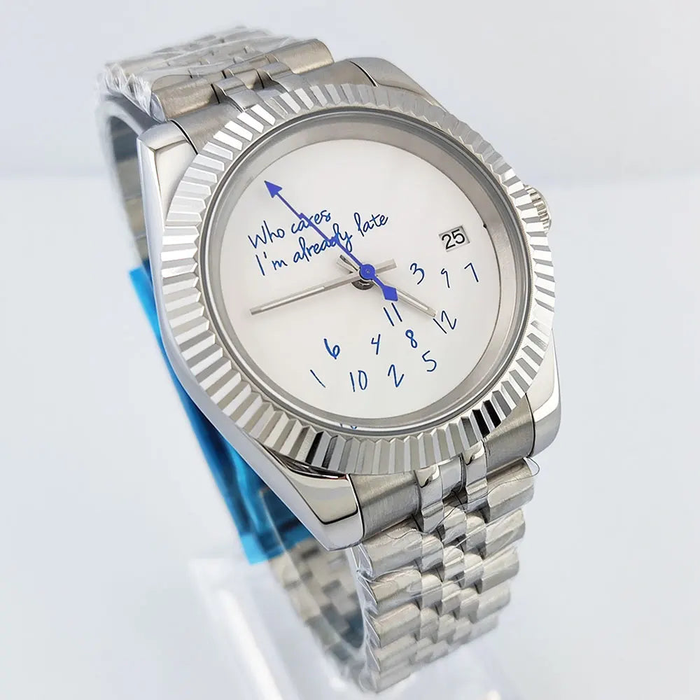 DateJust Seiko NH35 watch "Who Cares I'm already Late" dial customized logo 39mm/36mm Glass Back Sapphire 10bar
