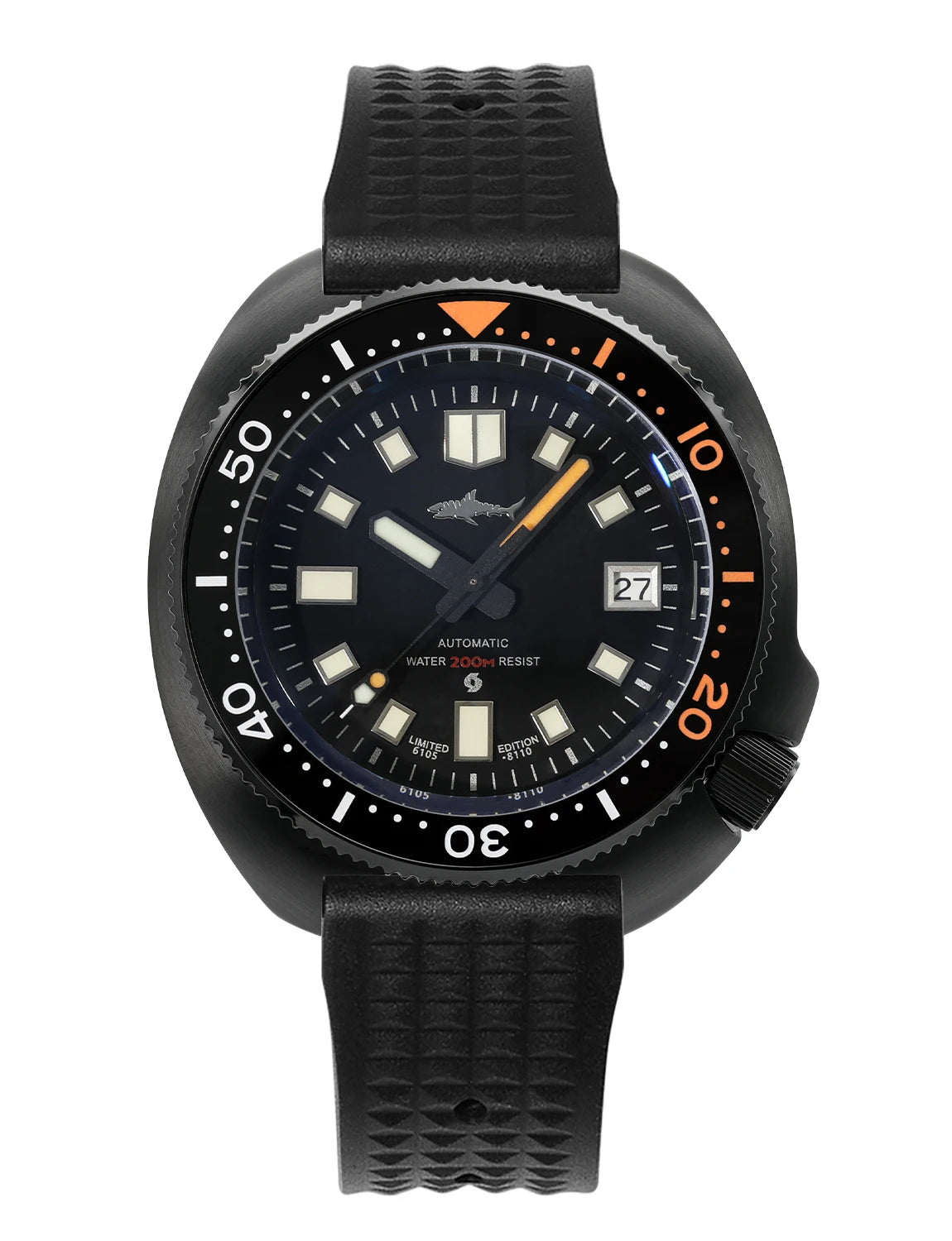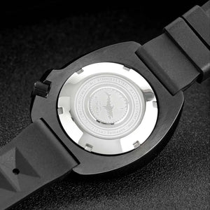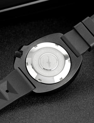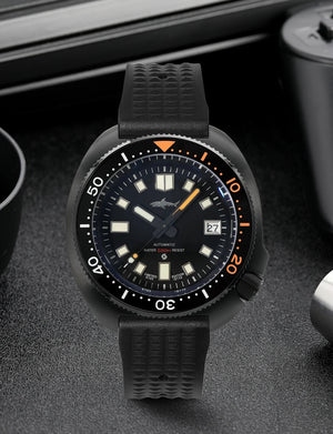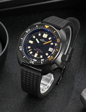 Inspired by the iconic "Captain Willard" design, this Black PVD 6105 Diver Watch combines rugged retro styling with modern performance. The 44mm case is finished in durable 316L Stainless Steel with black PVD coating, housing the reliable Seiko NH35A automatic movement. Featuring a unidirectional ceramic bezel, sapphire crystal, and 200m water resistance, it's a bold, capable timepiece built for adventure.