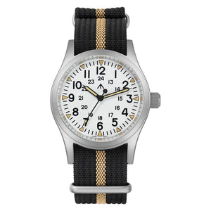 The Militado ML05 White Dial exemplifies classic field watch design with contemporary precision. Housing a dependable VH31/VH60 sweep hand movement, this 38mm instrument features a sand-blasted 316L stainless steel case that develops character with age. The domed sapphire crystal with anti-reflective coating minimizes glare for optimal dial visibility, while luminous Super C3 hands cut through darkness with reliable glow. Engineered for genuine utility, the screw-down crown ensures water resistance to 100m, making it suitable for diverse environments. Its compact 10.5mm profile and 47.5mm lug-to-lug measurement provide comfortable everyday wearability without sacrificing presence. Comprehensive 2-year warranty and accessible return policies underscore Militado's commitment to customer satisfaction and product integrity.