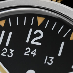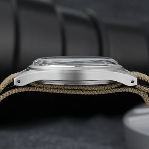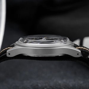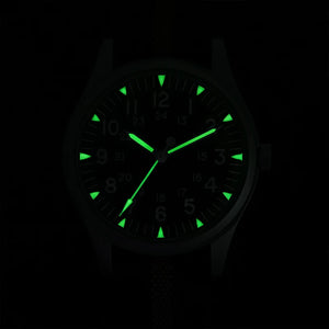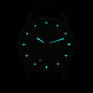 The Militado ML07 Military Watch features a reliable VH31 quartz movement, ensuring precise timekeeping. Its sapphire crystal with anti-reflective coating offers exceptional scratch resistance and clear visibility. Designed for durability, this watch is water-resistant up to 10 bar, suitable for various outdoor activities. The luminous hands and markers provide excellent readability in low-light conditions, making it a dependable choice for military and tactical use.
