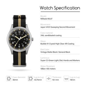 Militado ML07 Military Watch VH31 Quartz Sapphire Luminous AR Coating 10bar