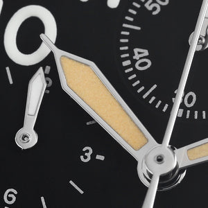 Equipped with the reliable Japan VK67 movement, offering sub-second, 60-minute, and 12-hour chronograph functions. A ±0.5-second tolerance in the central chronograph hand alignment is normal due to gear tolerance.