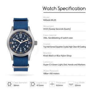 Militado VH31 Quartz Vintage Military Watch ML05 Blue white black Dial