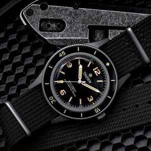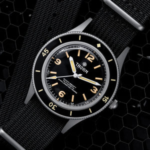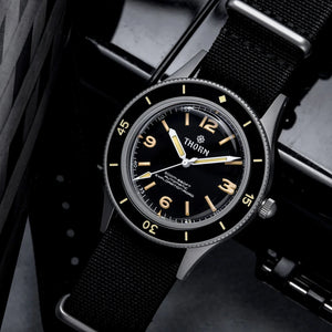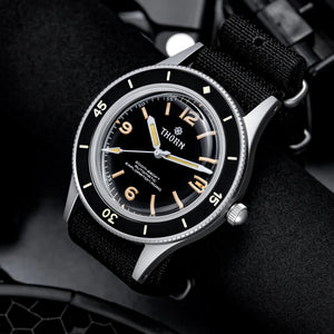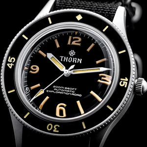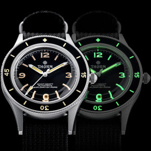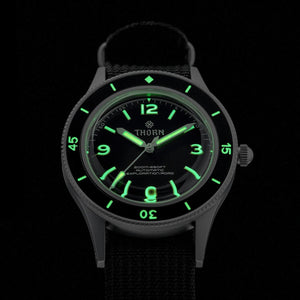 The NH35 movt 50 Fathoms Watch THORN SHY033 is a limited edition mechanical dive watch engineered for adventure. Built with a 316L stainless steel case and powered by a Japan NH35 automatic movement, it delivers precision and durability in extreme conditions. With 20ATM (200m) water resistance, a 120-click unidirectional ceramic bezel, and Swiss C3 super luminous markers, it ensures readability and reliability underwater. The canvas strap provides a secure and comfortable fit, making it the perfect companion for both diving and everyday wear.