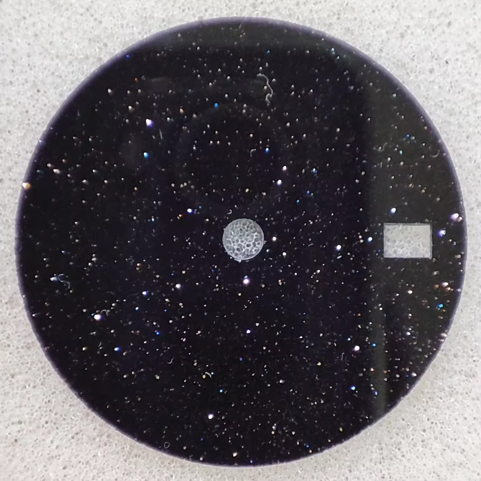 Precision-engineered Starry dial crafted from natural malachite sandstone, featuring a captivating starry blue-green pattern that catches light with every movement. This 28.5mm dial is meticulously cut using CNC technology to ensure perfect compatibility with NH35 and NH36 movements. The sparkling mineral surface creates depth and dimension, transforming your timepiece into a distinctive wearable art piece. Ideal for watch enthusiasts seeking distinctive aesthetics without compromising on mechanical precision.